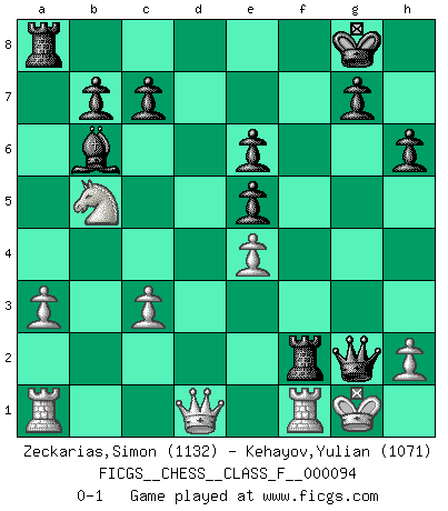 Last move : 0-1 2011 March 29 13:40:51 [Event "FICGS__CHESS__CLASS_F__000094"] [Site "FICGS"] [Date "2011.03.10"] [Round "1"] [White "Zeckarias,Simon"] [Black "Kehayov,Yulian"] [Result "0-1"] [WhiteElo "1132"] [BlackElo "1071"] 1.e4 e5 2.Nf3 Nc6 3.Bc4 Bc5 4.O-O Nf6 5.Nc3 O-O 6.d3 d6 7.Bg5 Be6 8.Bxe6 fxe6 9.a3 a6 10.b4 Ba7 11.b5 axb5 12.Nxb5 Bb6 13.c3 h6 14.Bxf6 Qxf6 15.d4 Qg6 16.dxe5 Nxe5 17.Nxe5 dxe5 18.Re1 Rxf2 19.Rf1 Qxg2+ 0-1 Giuoco Piano Kingside Castling by player White (move 4) Kingside Castling by player Black (move 5) Player Black won this chess game. Follow this game move after move (download)Chess is everything: art, science and sport. (Anatoly Karpov) Wer sich die Fähigkeit anerziehen will im Schach selbstständig zu denken, der muß alles meiden, was leblos ist: ausgeklügelte Theorien, die sich auf sehr wenige Beispiele und eine Menge Hirngespinste stützen. (Emanuel Lasker) Los asuntos humanos son como una partida de Ajedrez: solo aquellos que no lo toman seriamente, pueden ser llamados buenos jugadores. (Hung Tzu Ch'eng) Aucun coup ne doit être joué sans but. (Pedro Damiano) Macintosh - we might not get everything right, but at least we knew the century was going to end. (Douglas Adams)