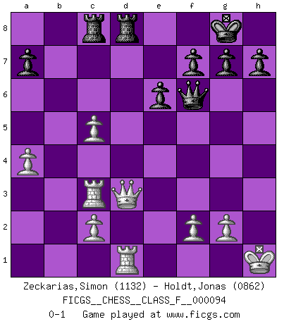 Last move : 0-1 2011 April 14 14:41:53 [Event "FICGS__CHESS__CLASS_F__000094"] [Site "FICGS"] [Date "2011.03.10"] [Round "1"] [White "Zeckarias,Simon"] [Black "Holdt,Jonas"] [Result "0-1"] [WhiteElo "1132"] [BlackElo "0862"] 1.e4 d5 2.exd5 Qxd5 3.Nc3 Qa5 4.Nf3 c6 5.d4 Nf6 6.Ne5 Bf5 7.Bd3 Bxd3 8.Qxd3 e6 9.O-O Nbd7 10.Nxd7 Nxd7 11.Bd2 Qc7 12.a4 Bd6 13.b4 Bxh2+ 14.Kh1 Bd6 15.b5 O-O 16.Ne4 Bf4 17.Bxf4 Qxf4 18.bxc6 bxc6 19.Ra3 Nf6 20.Nxf6+ Qxf6 21.Rc3 Rac8 22.Rd1 c5 23.dxc5 Rfd8 0-1 Scandinavian (centre counter) defense Kingside Castling by player White (move 9) Kingside Castling by player Black (move 15) Player Black won this chess game. Follow this game move after move (download)All Chess players should have a hobby. (Savielly Tartakower) Alles was am Schachbrett zählt sind gute Züge. (Robert James Fischer) La única cosa que los jugadores de Ajedrez tienen en común, es el Ajedrez. (Lodewijk Prins) Mais n'est-ce pas déjà le limiter injurieusement que d'appeler les échecs un jeu? N'est-ce pas aussi une science, un art, ou quelque chose qui, comme le cercueil de Mahomet entre ciel et terre, est suspendu entre l'un et l'autre, et qui réunit un nombre incroyable de contraires ? (Stefan Zweig) Computer Science is no more about computers than astronomy is about telescopes. (Edsger W. Dijkstra)