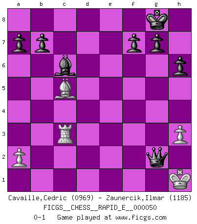 Last move : 0-1 2011 April 16 22:45:38 [Event "FICGS__CHESS__RAPID_E__000050"] [Site "FICGS"] [Date "2011.03.11"] [Round "1"] [White "Cavaille,Cedric"] [Black "Zaunercik,Ilmar"] [Result "0-1"] [WhiteElo "0969"] [BlackElo "1185"] 1.e4 e5 2.Nf3 Nc6 3.Bc4 Bc5 4.c3 Nf6 5.Ng5 O-O 6.b4 Bb6 7.Na3 Bxf2+ 8.Kxf2 Ng4+ 9.Qxg4 d5 10.Qh4 h6 11.Nf3 Qd6 12.exd5 Ne7 13.Re1 Nf5 14.Nb5 Qb6+ 15.d4 Nxh4 16.Nxh4 Qf6+ 17.Nf3 Bg4 18.Nxc7 Bxf3 19.Nxa8 Bxd5 20.Kg1 Bxc4 21.Nc7 exd4 22.Ba3 dxc3 23.Ne8 Qd4+ 24.Kh1 Qd8 25.b5 Rxe8 26.Rxe8+ Qxe8 27.Rc1 Bxb5 28.h3 Qe2 29.Rxc3 Bc6 30.Bc5 Qxg2+ 0-1 Giuoco Piano Kingside Castling by player Black (move 5) Player Black won this chess game. Follow this game move after move (download)Don't even mention losing to me. I can't stand to think of it. (Bobby Fischer) Auf jeden Fall musst du zuerst Rechtsanwalt werden, damit du deine eigenen Interessen und die deiner Familie vertreten kannst. [Brief an seinen Sohn] (José Raúl Capablanca) Si el ingenio solamente fuese necesario para lucirse, las mujeres serían las mejores jugadoras de Ajedrez del mundo. (Albin) Seul un grand joueur sait à quel point il joue faiblement. (Xavier Tartacover) We need strong personalities and only one world champion to attract sponsors. (Anatoly Karpov)