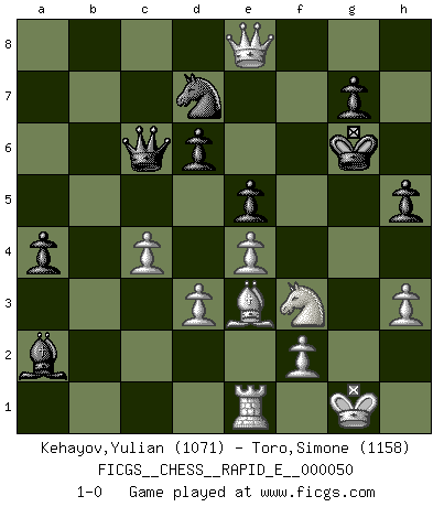 Last move : 1-0 2011 April 21 21:19:50 [Event "FICGS__CHESS__RAPID_E__000050"] [Site "FICGS"] [Date "2011.03.11"] [Round "1"] [White "Kehayov,Yulian"] [Black "Toro,Simone"] [Result "1-0"] [WhiteElo "1071"] [BlackElo "1158"] 1.Nc3 e5 2.Nf3 Nc6 3.e4 Nf6 4.Bc4 h6 5.d3 Bb4 6.O-O O-O 7.Nd5 Re8 8.Be3 d6 9.Nxb4 Nxb4 10.c3 Nc6 11.Qb3 b6 12.Bxf7+ Kh8 13.Bxe8 Qxe8 14.Rfe1 Be6 15.Qd1 Bg4 16.h3 Bh5 17.b4 a5 18.b5 Nd8 19.Rb1 Ne6 20.g4 Bf7 21.Rb2 a4 22.Qc2 Ra5 23.Rb4 c5 24.bxc6 Qxc6 25.Rxb6 Qc7 26.Qb1 Nd8 27.Qb4 Nc6 28.Rxc6 Qxc6 29.Qxa5 Bxa2 30.c4 Nd7 31.Qd8+ Kh7 32.g5 h5 33.g6+ Kxg6 34.Qe8+ 1-0 Dunst (Sleipner-Heinrichsen) Opening Kingside Castling by player White (move 6) Kingside Castling by player Black (move 6) Player White won this chess game. Follow this game move after move (download)Every Pawn is a potential Queen. (James Mason) Schach ist Kampf, hauptsächlich jedoch gegen die eigenen Fehler. (Savielly Grigorievitsch Tartakower) El Ajedrez es como la guerra en un tablero. (Bobby Fischer) Vouloir jouer aux échecs contre soi-même est aussi paradoxal que vouloir marcher sur son ombre. (Stefan Zweig) Follow your passion, and success will follow you. (Arthur Buddhold)