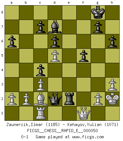 Last move : 0-1 2011 July 2 8:12:19 [Event "FICGS__CHESS__RAPID_E__000050"] [Site "FICGS"] [Date "2011.03.11"] [Round "1"] [White "Zaunercik,Ilmar"] [Black "Kehayov,Yulian"] [Result "0-1"] [WhiteElo "1185"] [BlackElo "1071"] 1.e4 e5 2.Nf3 Nc6 3.Bb5 Nf6 4.O-O Bc5 5.c3 Be7 6.d3 d6 7.Nbd2 O-O 8.Re1 a6 9.Ba4 h6 10.h3 Re8 11.Nf1 Be6 12.d4 b5 13.Bb3 Bd7 14.d5 Na5 15.Bc2 Qc8 16.Ng3 Bd8 17.Bd2 Nc4 18.Bc1 Na5 19.Nh4 Nxd5 20.exd5 Bxh4 21.Qf3 Qd8 22.Nf5 Bg5 23.Bxg5 Qxg5 24.Ne3 Nc4 25.Nxc4 bxc4 26.Re3 f5 27.R3e1 e4 28.Qd1 e3 29.fxe3 Rxe3 30.Rxe3 Qxe3+ 31.Kh1 Qf2 32.Rc1 Re8 33.Qf1 Qd2 34.Kh2 Re2 0-1 This chess game has been lost on time (started : 2011.03.11 22:7:52) Ruy Lopez : Berlin defense, Beverwijk variation Kingside Castling by player White (move 4) Kingside Castling by player Black (move 7) Player Black won this chess game. Follow this game move after move (download)A man without frontiers. He didn't divide the East and the West, he brought them together in their admiration for him. (Ljubomir Ljubojevic, about Bobby Fischer's death) Ja, ich habe einmal eine Blitzpartie gespielt, es war in einem Zug, 1929. --im Interview 1989 (Mikhail Moiseyevich Botvinik) Si tu oponente te ofrece un empate, trata de averiguar porque piensa él que esta en una posición peor. (Nigel Short) J'ai toujours senti une vague pitié pour l'homme qui ne connaît rien aux échecs, tout comme j'en aurais pour un homme ignorant de l'amour. Les Echecs, comme la musique ou comme l'amour, ont le pouvoir de rendre heureux. (Siegbert Tarrasch) There are lots of people who mistake their imagination for their memory. (Josh Bilings)