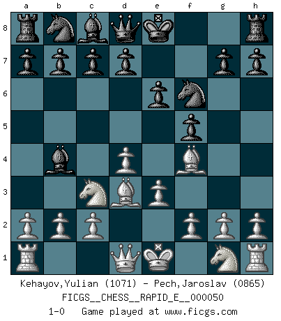 Last move : 1-0 2011 May 20 18:28:35 [Event "FICGS__CHESS__RAPID_E__000050"] [Site "FICGS"] [Date "2011.03.11"] [Round "1"] [White "Kehayov,Yulian"] [Black "Pech,Jaroslav"] [Result "1-0"] [WhiteElo "1071"] [BlackElo "0865"] 1.d4 f5 2.Bf4 Nf6 3.Nc3 e6 4.e3 Bb4 5.Bd3 1-0 This chess game has been lost on time (started : 2011.03.11 22:7:52) Dutch Player White won this chess game. Follow this game move after move (download)By this measure (on the gap between Fischer & his contemporaries), I consider him the greatest world champion. (Garry Kasparov) Spielt Blackmar-Diemer-Gambit, und das Matt kommt von selbst! (Emil Joseph Diemer) Me gusta decir que Bobby Fischer fue el mejor jugador que jamás haya existido. Pero lo que hizo de Fischer un genio, fue su habilidad de mezclar una frescura y pragmatismo Americano con ideas Rusas acerca de la estrategia. (Bruce Pandolfini) Toute estimation doit être constamment réévaluée. (Jacob Estrin) In theory there is no difference between theory and practice. In practice there is. (Yogi Berra)