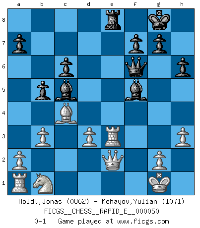 Last move : 0-1 2011 April 22 22:26:0 [Event "FICGS__CHESS__RAPID_E__000050"] [Site "FICGS"] [Date "2011.03.11"] [Round "1"] [White "Holdt,Jonas"] [Black "Kehayov,Yulian"] [Result "0-1"] [WhiteElo "0862"] [BlackElo "1071"] 1.b3 Nc6 2.Bb2 e5 3.e3 Nf6 4.Bb5 Bb4 5.Ne2 O-O 6.O-O Re8 7.f4 h6 8.fxe5 Nxe5 9.Nf4 c6 10.Be2 d5 11.c4 dxc4 12.Bxe5 Rxe5 13.Bxc4 Bf5 14.Qe2 Qe7 15.h3 Rd8 16.Nh5 b5 17.Nxf6+ Qxf6 18.d3 Bc5 19.Rf3 Rxe3 20.Rxe3 Re8 0-1 Nimzovich-Larsen attack Kingside Castling by player Black (move 5) Kingside Castling by player White (move 6) Player Black won this chess game. Follow this game move after move (download)The defensive power of a pinned piece is only imaginary. (Aaron Nimzovich) Es ist nicht das erste mal, dass sich die FIDE dem Arabischen Geld gebeugt hat (über die FIDE WM 2004 in Lybien). (Larry Evans) Te sientas frente a un tablero y repentinamente tu corazón brinca. Tu mano tiembla al tomar una pieza y moverla. Pero lo que el Ajedrez te enseña es que tu debes permanecer ahí con calma y pensar de que si realmente es una buena idea o de que si hay otras ideas mejores. (Stanley Kubrick) Les Echecs ne sont pas pour les âmes timides. Ils requièrent un homme entier, qui ne s'arrête pas aveuglément à ce qui a été déjà établi, mais qui tente individuellement de sonder les profondeurs du jeu. (W. Steinitz) It is the aim of the modern school, not to treat every position according to one general law, but according to the principle inherent in the position. (Richard Reti)