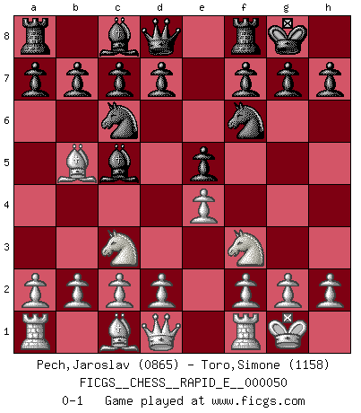 Last move : 0-1 2011 May 20 6:27:33 [Event "FICGS__CHESS__RAPID_E__000050"] [Site "FICGS"] [Date "2011.03.11"] [Round "1"] [White "Pech,Jaroslav"] [Black "Toro,Simone"] [Result "0-1"] [WhiteElo "0865"] [BlackElo "1158"] 1.e4 e5 2.Nf3 Nc6 3.Nc3 Nf6 4.Bb5 Bc5 5.O-O O-O 0-1 This chess game has been lost on time (started : 2011.03.11 22:7:52) Four knights : Spanish, Classical defense Kingside Castling by player White (move 5) Kingside Castling by player Black (move 5) Player Black won this chess game. Follow this game move after move (download)Robert Fischer is a law unto himself. (Larry Evans) Stil? Ich habe keinen Stil! (Anatoly Karpov) Buenas posiciones no logran ganar juegos, buenas movidas sí. (Gerald Abrahams) La victoire dans une partie d'Echecs appartient la plupart du temps à celui qui voit un peu plus loin que l'adversaire. (Lasker) For a mechanic, you seem to do an excessive amount of thinking. (C-3PO in Star Wars ep.2)