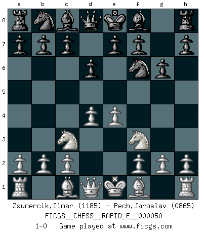 Last move : 1-0 2011 May 22 10:26:15 [Event "FICGS__CHESS__RAPID_E__000050"] [Site "FICGS"] [Date "2011.03.11"] [Round "1"] [White "Zaunercik,Ilmar"] [Black "Pech,Jaroslav"] [Result "1-0"] [WhiteElo "1185"] [BlackElo "0865"] 1.e4 d6 2.d4 Nf6 3.Nc3 g6 4.Nf3 1-0 Pirc : Classical (Two knights) system Player White won this chess game. Follow this game move after move (download)Suddenly it was obvious to me in my analysis I had missed what Fischer had found with the greatest of ease at the board. (Mikhail Botvinnik) Kleine Schachspieler machen Mist, und große Schachspieler machen Mist, aber große machen weniger Mist. (Fritz Sämisch) Cuando veas una buena jugada, trata de encontrar otra mejor. (Emanuel Lasker) Le joueur d'Echecs qui veut atteindre le top est obligé de développer son propre credo créatif. Alexeï Stepanovicth Souétine. Il est facile d'écrire des livres ! Ce qui est difficile, c'est de jouer ! (Alexeï Stepanovicth Souétine) Wawaweewa ! (Borat: Cultural learnings of America for make benefit glorious nation of Kazakhstan)