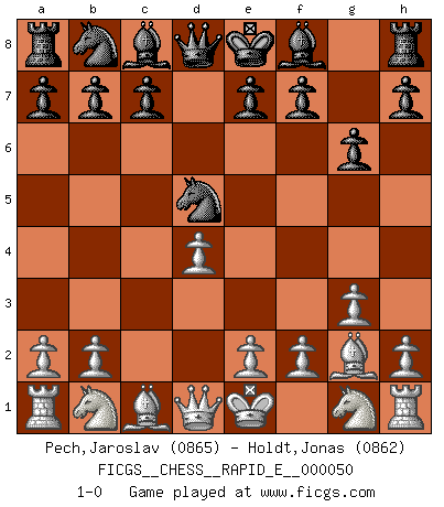 Last move : 1-0 2011 June 7 7:15:20 [Event "FICGS__CHESS__RAPID_E__000050"] [Site "FICGS"] [Date "2011.03.11"] [Round "1"] [White "Pech,Jaroslav"] [Black "Holdt,Jonas"] [Result "1-0"] [WhiteElo "0865"] [BlackElo "0862"] 1.d4 Nf6 2.c4 g6 3.g3 d5 4.cxd5 Nxd5 5.Bg2 1-0 This chess game has been lost on time (started : 2011.03.11 22:7:52) King's Indian : 3.g3 Player White won this chess game. Follow this game move after move (download)There just isn't enough televised Chess. (David Letterman) Eine Person mit durchschnittlichem IQ kann etwa eine ELO von 2000 erreichen. (Jonathan Levitt) Tu sabes que vas a perder. Aún cuando tenía la ventaja, yo sabía que iba a perder. - al estar jugando con Fischer (Andrew Soltis) Demandez au pauvre Cg1 ce qu'il en pense. Eduard Gufeld à propos de la variante Saemisch de l'Est-Indienne. It is not enough to be a good player... you must also play well. (Siegbert Tarrasch)