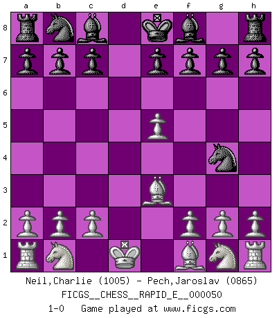 Last move : 1-0 2011 May 19 6:19:6 [Event "FICGS__CHESS__RAPID_E__000050"] [Site "FICGS"] [Date "2011.03.11"] [Round "1"] [White "Neil,Charlie"] [Black "Pech,Jaroslav"] [Result "1-0"] [WhiteElo "1005"] [BlackElo "0865"] 1.e4 d6 2.d4 Nf6 3.e5 dxe5 4.dxe5 Qxd1+ 5.Kxd1 Ng4 6.Be3 1-0 This chess game has been lost on time (started : 2011.03.11 22:7:52) King's pawn Opening Player White won this chess game. Follow this game move after move (download)Best by test: 1. e4 (Bobby Fischer) Du musst nicht gut spielen, es reicht, wenn du besser spielst als dein Gegner. (Anonymous) Una de estas pequeñas movidas modestas pudieran ser mas molestas a tu oponente que la amenaza mas grande. (Siegbert Tarrasch) Il a essayé de se convaincre qu'il pourrait empêcher toutes les erreurs et ne jamais perdre. L'horreur ! Gary Kasparov au sujet de Robert Fischer. When you have everything, sometimes it feels like nothing. (Horatio Caine, C.S.I. Miami)