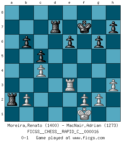 Last move : 0-1 2007 February 9 22:8:56 [Event "FICGS__CHESS__RAPID_C__000016"] [Site "FICGS"] [Date "2006.12.14"] [Round "1"] [White "Moreira,Renato"] [Black "MacNair,Adrian"] [Result "0-1"] [WhiteElo "1400"] [BlackElo "1273"] 1.e4 g6 2.d4 Bg7 3.Nf3 d6 4.h3 Nf6 5.Nc3 O-O 6.Be3 c6 7.Be2 Nbd7 8.Qd2 Qc7 9.O-O b6 10.Bh6 Ne8 11.Bxg7 Nxg7 12.Qh6 Nf6 13.e5 Nf5 14.Qd2 dxe5 15.dxe5 Nd7 16.e6 fxe6 17.Bc4 Ne5 18.Nxe5 Qxe5 19.Rae1 Qd4 20.Qe2 Ng3 21.Bxe6+ Kg7 22.Qe5+ Qxe5 23.Rxe5 Nxf1 24.Kxf1 Re8 25.Re3 Bxe6 26.Rxe6 c5 27.Nd5 Kf7 28.Re3 Rad8 29.c4 e6 30.Nc3 Rd2 31.Nb5 a6 32.Nc7 Re7 33.Nxa6 Ra7 34.Nb8 Rxa2 35.Nd7 Rxd7 0-1 Robatsch (Modern) defense Kingside Castling by player Black (move 5) Kingside Castling by player White (move 9) Player Black won this chess game. Follow this game move after move (download)All that matters on the Chessboard is good moves. (Bobby Fischer) Das Schach hält seine Meister in eigenen Banden, Fesseln; auf vielerlei Weise formt es ihren Geist, so dass die innere Freiheit selbst des Stärksten beeinflusst wird. (Albert Einstein) a manera como él juega al Ajedrez, demuestra la completa naturaleza de un hombre. (Stanley Ellin) Des combinaisons [dans le jeu d'échecs] pareilles à des mélodies. Je crois entendre pour ainsi dire la musique des coups... (Vladimir Nabokov) The project of the man are lower than those of the sky. (Chinese proverb)