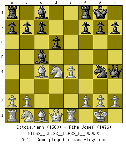 Last move : 0-1 2006 May 30 8:24:57 [Event "FICGS__CHESS__CLASS_E__000003"] [Site "FICGS"] [Date "2006.05.02"] [Round "1"] [White "Catois,Yann"] [Black "Riha,Josef"] [Result "0-1"] [WhiteElo "1560"] [BlackElo "1476"] 1.e4 e5 2.Nf3 Nc6 3.Bc4 Bc5 4.c3 Nf6 5.d3 d6 6.O-O O-O 7.Re1 Ng4 8.d4 exd4 9.cxd4 Nxd4 10.Nxd4 Qh4 0-1 Giuoco Piano Kingside Castling by player White (move 6) Kingside Castling by player Black (move 6) Player Black won this chess game. Follow this game move after move (download)Look at Garry Kasparov. After he loses, invariably he wins the next game. He just kills the next guy. That's something that we have to learn to be able to do. (Maurice Ashley) Wenn Du absolut nicht mehr weißt, was Du tun sollst, dann ist es Zeit für Panik. (John van der Wiel) Siempre es mucho mejor sacrificar las piezas de tu oponente. (Savielly Tartakover) Si le désir cupide (et stupide) de gagner est une inépuisable source de souffrance, une combinaison brillante sur l'échiquier est une découverte : le coquelicot qui s'épanouit lorsque apparaît la Voie Lactée. (Arrabal) Man with more than one clock never knows what time it is. (Chinese thought)