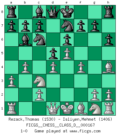 Last move : 1-0 2011 May 8 5:43:4 [Event "FICGS__CHESS__CLASS_D__000167"] [Site "FICGS"] [Date "2011.03.13"] [Round "1"] [White "Rezack,Thomas"] [Black "Isliyen,Mehmet"] [Result "1-0"] [WhiteElo "1530"] [BlackElo "1406"] 1.e4 e6 2.d4 d5 3.Nc3 Bb4 4.e5 Ne7 5.a3 Ba5 6.b4 Bb6 7.Bg5 h6 8.Bh4 Nbc6 9.f4 1-0 This chess game has been lost on time (started : 2011.03.13 12:7:44) French : Winawer, Advance variation Player White won this chess game. Follow this game move after move (download)Chess is as much a mystery as women. (Purdy) Modernes Schach erfordert enorme Anspannung. Es ist für einen normalen Menschen unmöglich das auszuhalten. (Viktor Kortschnoi) Me dio la sensación de como si yo estuviera jugando en contra del mismo Ajedrez. - al estar jugando en contra de Robert Fischer (Walter Shipman) En blitz, le Cavalier l'emporte sur le Fou. (Vlastimil Hort) Somehow our devils are never quite what we expect when we meet them face to face. (Nelson DeMille)