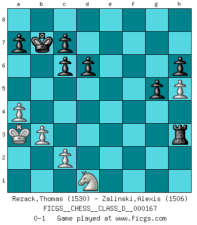 Last move : 0-1 2011 June 10 12:47:7 [Event "FICGS__CHESS__CLASS_D__000167"] [Site "FICGS"] [Date "2011.03.13"] [Round "1"] [White "Rezack,Thomas"] [Black "Zalinski,Alexis"] [Result "0-1"] [WhiteElo "1530"] [BlackElo "1506"] 1.e4 e5 2.Nf3 Nf6 3.d4 exd4 4.Nxd4 Nxe4 5.Qe2 Qe7 6.Be3 Nf6 7.Nc3 d6 8.O-O-O Bd7 9.Bg5 Qxe2 10.Bxe2 Nc6 11.Nxc6 Bxc6 12.f3 Be7 13.Rhe1 O-O-O 14.Bb5 Rhe8 15.Bxc6 bxc6 16.a4 h6 17.Be3 Kb7 18.Rd3 Nd7 19.Bf2 Bg5+ 20.Kb1 Ne5 21.R3d1 Nc4 22.Ne4 Bf4 23.b3 Ne5 24.g3 Nxf3 25.gxf4 Nxe1 26.Rxe1 Re6 27.Nc3 Rde8 28.Rg1 g6 29.Bg3 Re3 30.Kb2 f6 31.h4 Rf3 32.Rd1 Rxg3 33.Rh1 R8e3 34.Nd1 Ref3 35.h5 g5 36.fxg5 fxg5 37.Ka3 Rh3 38.Rxh3 Rxh3 0-1 Petrov : Modern (Steinitz) attack Queenside Castling by player White (move 8) Queenside Castling by player Black (move 13) Player Black won this chess game. Follow this game move after move (download)Though most people love to look at the games of the great attacking masters, some of the most successful players in history have been the quiet positional players. They slowly grind you down by taking away your space, tying up your pieces, and leaving you with virtually nothing to do ! (Yasser Seirawan) Wir irren allesamt, nur jeder irrt anders. (Georg Christoph Lichtenberg) Hay jugadores fuertes y personas amables y yo soy un jugador fuerte. (Bobby Fischer) Comme les marins qui ont mille raisons différentes d'aller en mer, les joueurs d'échecs en ont tout autant avant de s'installer devant une table et jouer... (Vincent Bertignac, philosophe) Art disturbs, science reassures. (Georges Braque, Le Jour et la Nuit)