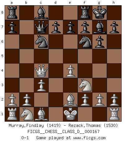 Last move : 0-1 2011 May 7 5:37:28 [Event "FICGS__CHESS__CLASS_D__000167"] [Site "FICGS"] [Date "2011.03.13"] [Round "1"] [White "Murray,Findlay"] [Black "Rezack,Thomas"] [Result "0-1"] [WhiteElo "1419"] [BlackElo "1530"] 1.e4 c5 2.c3 g6 3.d4 b6 4.dxc5 bxc5 5.Qd5 Nc6 6.Qxc5 Qc7 7.Nf3 Bg7 8.Be2 Nf6 9.Qc4 O-O 0-1 This chess game has been lost on time (started : 2011.03.13 12:7:44) Sicilian : Alapin's variation (2.c3) Kingside Castling by player Black (move 9) Player Black won this chess game. Follow this game move after move (download)We like to think. (Gary Kasparov) Wer wird heute Abend ihr Gegner sein? -- Heute Abend spiele ich gegen die schwarzen Steine. (Akiba Rubinstein) a manera como él juega al Ajedrez, demuestra la completa naturaleza de un hombre. (Stanley Ellin) Des combinaisons [dans le jeu d'échecs] pareilles à des mélodies. Je crois entendre pour ainsi dire la musique des coups... (Vladimir Nabokov) There is no vagueness without wind. (Chinese proverb)