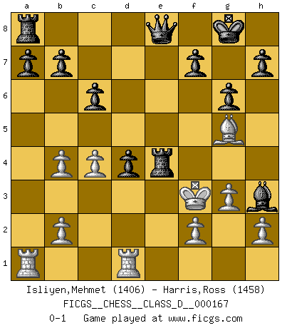 Last move : 0-1 2011 March 28 19:56:44 [Event "FICGS__CHESS__CLASS_D__000167"] [Site "FICGS"] [Date "2011.03.13"] [Round "1"] [White "Isliyen,Mehmet"] [Black "Harris,Ross"] [Result "0-1"] [WhiteElo "1406"] [BlackElo "1458"] 1.d4 d5 2.g3 e6 3.Bg2 Nf6 4.Nc3 Nbd7 5.e4 dxe4 6.Nxe4 Be7 7.Be3 O-O 8.Nh3 c6 9.c4 e5 10.Qc2 Nxe4 11.Bxe4 Bb4+ 12.Ke2 g6 13.Bh6 Re8 14.a3 Nf6 15.axb4 Nxe4 16.Qxe4 exd4 17.Bg5 Rxe4+ 18.Kf3 Qe8 19.Rhd1 Bxh3 0-1 Queen's pawn game Kingside Castling by player Black (move 7) Player Black won this chess game. Follow this game move after move (download)Chess is a matter of delicate judgment, knowing when to punch and how to duck. (Bobby Fischer) Es war undenkbar für die Behörden, dass ein sowjetischer Großmeister auf diese Art und Weise [Fischer-Taimanov 6:0] verliert, ohne dass es eine politischer Erklärung dafür gäbe. (Mark Taimanov) A la fecha, Fischer esta simplemente un nivel arriba de todos los mejores jugadores de Ajedrez del mundo. (John Jacobs) La vie est comme un jeu d'échecs : nous esquissons un plan, mais celui-ci est tributaire de ce que daignent faire l'adversaire aux échecs et le destin dans la vie. (Arthur Schopenhauer) Players are not good because they find tactics, it is about the way to find the positions in which those tactics are hidden. (Luc-Olivier Leclerc)