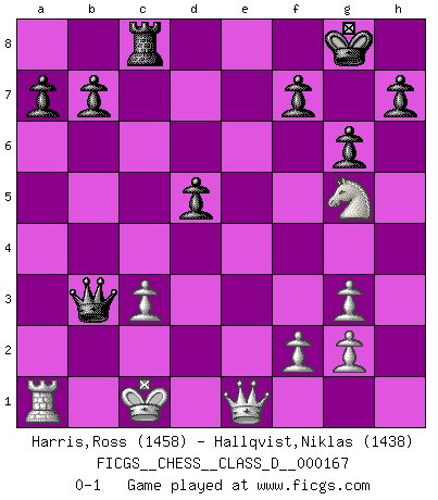 Last move : 0-1 2011 March 18 16:24:55 [Event "FICGS__CHESS__CLASS_D__000167"] [Site "FICGS"] [Date "2011.03.13"] [Round "1"] [White "Harris,Ross"] [Black "Hallqvist,Niklas"] [Result "0-1"] [WhiteElo "1458"] [BlackElo "1438"] 1.d4 e6 2.Nf3 c5 3.c3 Nc6 4.Bf4 Nf6 5.e3 Nh5 6.Bg3 Nxg3 7.hxg3 g6 8.Nbd2 d5 9.Bd3 Qb6 10.Qb1 Bg7 11.Ng5 cxd4 12.exd4 e5 13.dxe5 Nxe5 14.Be2 Bf5 15.Qc1 Nd3+ 16.Bxd3 Bxd3 17.Nb3 O-O 18.Qd2 Rae8+ 19.Kd1 Bc4 20.Re1 Bxb3+ 21.axb3 Qxb3+ 22.Kc1 Bxc3 23.bxc3 Rxe1+ 24.Qxe1 Rc8 0-1 Comment by player 2 : Niklas Hallqvist : I found the opening intriguing, some kind of Indian game vs. the London system. Only after the fact when looking for commentary on the opening I found this link: http://www.chesspublishing.com/content/8/jun03.htm There, Eric says that 3..Nc6 is specifically meant as anti 4.Bf4?!. Unfortunately he does not tell why, but gives a subscribers-only link to a game :-( Still 4 years later he himself played Bf4 in a blitz tournament (found in TWIC), so I guess he has since found something for white in that line, or it's just that blitz is different. My personal opinion is that black comes out quite well with a bishop pair, and then white goes on to make a few mistakes around the 10th move, allowing black to open the game, and developing the bishops to really cover the board. From there it was mostly a transport. Queen's pawn Kingside Castling by player Black (move 17) Player Black won this chess game. Follow this game move after move (download)I prefer to lose a really good game than to win a bad one. (David Levy) Schach ist ein schwarz-weisser Dschungel. (Garry Kasparov) Yo he agregado estos principios a la ley: pongan los Caballos en acción antes de que los dos Alfiles sean desarrollados. (Emanuel Lasker) RxDa4 pat (...) If we don't succeed, we run the risk of failure. (George W. Bush)