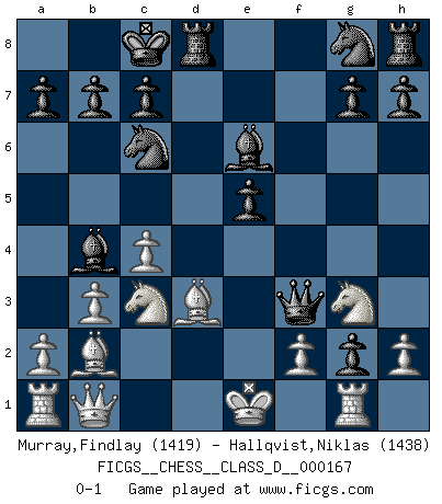 Last move : 0-1 2011 June 5 19:13:2 [Event "FICGS__CHESS__CLASS_D__000167"] [Site "FICGS"] [Date "2011.03.13"] [Round "1"] [White "Murray,Findlay"] [Black "Hallqvist,Niklas"] [Result "0-1"] [WhiteElo "1419"] [BlackElo "1438"] 1.e4 e6 2.d4 d5 3.Nd2 Be7 4.Bd3 Nc6 5.c3 dxe4 6.Nxe4 e5 7.d5 Qxd5 8.Be3 f5 9.c4 Qf7 10.Nc3 Bd7 11.b3 O-O-O 12.Nge2 Be6 13.Qb1 f4 14.Bc1 f3 15.Ng3 fxg2 16.Rg1 Bb4 17.Bb2 Qf3 0-1 French : Tarrasch Queenside Castling by player Black (move 11) Player Black won this chess game. Follow this game move after move (download)Don't even mention losing to me. I can't stand to think of it. (Bobby Fischer) Smyslow ist ein Beweis dafür, dass ich noch zehn Jahre spielen kann! [der 75 jährige über den 85 jährigen] (Viktor Kortschnoi) Fischer sacrificó virtualmente todo lo que la mayoría de nosotros los 'debiles' (término que él usa) valoramos, respetamos y apreciamos por el amor de un astuto, a menudo hermoso tablero de juego, por el privilegio ambivalente de ser su mas grande maestro. (Paul Kollar) Donnez-moi un Cavalier en 6e et je gagnerais toutes mes parties. (Steinitz) A generalist learns less and less about more and more until he knows nothing about everything. (Author unknown)