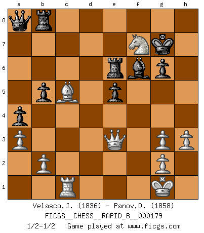 Last move : 1/2-1/2 2011 March 18 7:10:4 [Event "FICGS__CHESS__RAPID_B__000179"] [Site "FICGS"] [Date "2011.03.13"] [Round "1"] [White "Velasco,Jose Maria"] [Black "Panov,Dmitriy"] [Result "1/2-1/2"] [WhiteElo "1836"] [BlackElo "1858"] 1.e4 e5 2.Nf3 Nc6 3.Bb5 a6 4.Ba4 Nf6 5.O-O Be7 6.Re1 b5 7.Bb3 d6 8.c3 O-O 9.h3 Na5 10.Bc2 c5 11.d4 Qc7 12.Nbd2 cxd4 13.cxd4 Nc6 14.Nb3 a5 15.Be3 a4 16.Nbd2 Bd7 17.Rc1 Qb7 18.Qe2 Rfc8 19.a3 h6 20.Bd3 Rab8 21.Red1 Re8 22.dxe5 Nxe5 23.Nxe5 dxe5 24.Nf3 Bd8 25.Bc5 Re6 26.Nh4 Bc6 27.Nf5 Bxe4 28.Nd6 Bxd3 29.Rxd3 Qa8 30.Rg3 g6 31.Qe3 Nh5 32.Nxf7 Nxg3 33.Nxh6+ Kh7 34.fxg3 Bf6 35.Nf7 Kg7 1/2-1/2 Ruy Lopez : Closed Kingside Castling by player White (move 5) Kingside Castling by player Black (move 8) This chess game ended in a draw. Follow this game move after move (download)The game of Chess is not merely an idle amusement; several very valuable qualities of the mind are to be acquired and strengthened by it, so as to become habits ready on all occasions; for life is a kind of Chess. (Benjamin Franklin) Herr Iljumschinow ist ein etwas merkwürdiger Geschäftsmann: Er arbeitet zusammen mit Leuten wie Muammar al-Gaddafi; früher ist das Saddam Hussein gewesen. (Joel Lautier) El Ajedrez por encima de todo... ¡es una pelea!. (Emanuel Lasker) Psychologiquement, tu dois avoir confiance en toi même, mais cette confiance doit être basée sur des faits. (Robert Fischer) Do you know these so called Volunteers don't even get paid! (Simpsons)