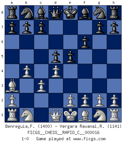 Last move : 1-0 2007 January 19 0:39:6 [Event "FICGS__CHESS__RAPID_C__000016"] [Site "FICGS"] [Date "2006.12.14"] [Round "1"] [White "Benreguia,Frederic"] [Black "Vergara Ravanal,Raul Andres"] [Result "1-0"] [WhiteElo "1400"] [BlackElo "1141"] 1.b4 e5 2.Ba3 d5 3.d4 f6 4.c3 1-0 This chess game has been lost on time (started : 2006.12.14 17:41:52) Polish (Sokolsky) opening Player White won this chess game. Follow this game move after move (download)Everything is in a state of flux, and this includes the world of Chess. (Mikhail Botvinnik) Ich verstehe mehr vom Schach als irgendein anderer lebender Meister. (José Raúl Capablanca) En manos de Fischer's, una diminuta ventaja teórica es tan buena como tener una Reina de ventaja. (Isaac Kashdan) Le jeu d'échecs est comme rejeté hors du temps. (Antoine de Saint-Exupéry) Either move or be moved. (Ezra Pound)