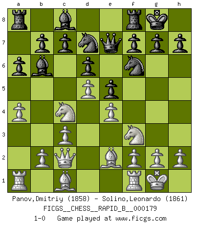Last move : 1-0 2011 April 30 16:53:35 [Event "FICGS__CHESS__RAPID_B__000179"] [Site "FICGS"] [Date "2011.03.13"] [Round "1"] [White "Panov,Dmitriy"] [Black "Solino,Leonardo"] [Result "1-0"] [WhiteElo "1858"] [BlackElo "1861"] 1.e4 e5 2.Nf3 Nc6 3.Bc4 Bc5 4.c3 Qe7 5.O-O Nf6 6.d4 Bb6 7.a4 a6 8.d5 Nb8 9.Nbd2 d6 10.Qc2 O-O 11.Be2 Nbd7 12.Nc4 1-0 This chess game has been lost on time (started : 2011.03.13 18:35:3) Giuoco Piano : close variation Kingside Castling by player White (move 5) Kingside Castling by player Black (move 10) Player White won this chess game. Follow this game move after move (download)If your opponent offers you a draw, try to work out why he thinks he's worse off. (Nigel Short) Schach ist ein Teil der Kultur, und wenn es mit der Kultur abwärts geht, geht es auch mit dem Schach abwärts. (Mikhail Moiseyevich Botvinik) Aún el Rey más flojo huye despavorido ante la amenaza de un Jaque doble. (Aaron Nimzowitsch) Nous sommes les pions de la mystérieuse partie d'Echecs jouée par Dieu. Il nous déplace, nous arrête, nous pousse encore, puis nous lance un à un dans la boîte du Néant. Epitaphe sur la tombe de David Janowsky (1868-1927). The bottom line is always the bottom line. (Johann Piek)