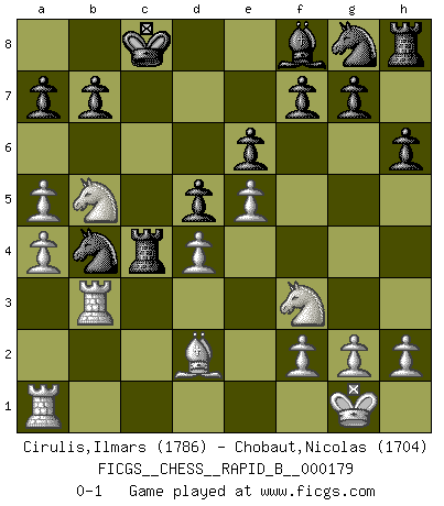 Last move : 0-1 2011 June 19 19:57:40 [Event "FICGS__CHESS__RAPID_B__000179"] [Site "FICGS"] [Date "2011.03.13"] [Round "1"] [White "Cirulis,Ilmars"] [Black "Chobaut,Nicolas"] [Result "0-1"] [WhiteElo "1786"] [BlackElo "1704"] 1.e4 e6 2.d4 d5 3.e5 c5 4.c3 Nc6 5.Nf3 Qb6 6.a4 Bd7 7.Bb5 cxd4 8.cxd4 Rc8 9.O-O Nb4 10.Bxd7+ Kxd7 11.Nc3 h6 12.a5 Qa6 13.Bd2 Rc6 14.Qa4 Nd3 15.Rfb1 Qc4 16.b3 Qxa4 17.bxa4 Kc8 18.Rb3 Nb4 19.Nb5 Rc4 0-1 This chess game has been lost on time (started : 2011.03.13 18:35:3) French : Advance, Paulsen attack Kingside Castling by player White (move 9) Player Black won this chess game. Follow this game move after move (download)I have added these principles to the law: get the Knights into action before both Bishops are developed. (Emanuel Lasker) Schach ist eine Sache der genauen Beurteilung, wann man zuschlagen und wann man sich ducken muss. (Robert James Fischer) ¿Esta Bobby Fischer algo cuerdo?. (Salo Flohr) Aux échecs, l'amour-propre est satisfait quand on remporte la victoire, mais il n'y a pas de honte à être battu. (Benjamin Franklin) Good decisions come from experience, and experience comes from bad decisions. (Anonymous)