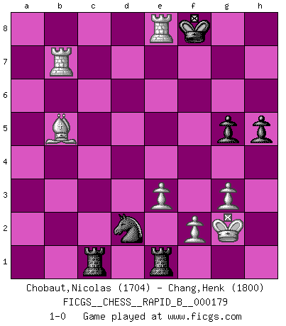 Last move : 1-0 2011 May 5 13:33:39 [Event "FICGS__CHESS__RAPID_B__000179"] [Site "FICGS"] [Date "2011.03.13"] [Round "1"] [White "Chobaut,Nicolas"] [Black "Chang,Henk"] [Result "1-0"] [WhiteElo "1704"] [BlackElo "1800"] 1.c4 g6 2.Nf3 Bg7 3.Nc3 Nf6 4.g3 O-O 5.Bg2 c6 6.O-O d5 7.d3 Be6 8.Qb3 Qb6 9.Qxb6 axb6 10.cxd5 Nxd5 11.Bd2 Nxc3 12.Bxc3 Bxa2 13.Bxg7 Kxg7 14.Ne5 f6 15.Nc4 Nd7 16.b4 Bxc4 17.dxc4 Ne5 18.b5 Nxc4 19.bxc6 bxc6 20.Bxc6 Rac8 21.Bd5 b5 22.Ra7 Rfe8 23.Rb1 Rc5 24.Bg2 Kf8 25.h4 Rec8 26.Rb7 Nd2 27.R1xb5 Rc1+ 28.Kh2 Nf1+ 29.Kh3 h5 30.Rd7 Re1 31.R5b7 Re8 32.e3 Kf7 33.Bd5+ Kf8 34.Kg2 g5 35.hxg5 fxg5 36.Bc6 Rc8 37.Bb5 R8c1 38.Rxe7 Nd2 39.Re8+ 1-0 English Opening Kingside Castling by player Black (move 4) Kingside Castling by player White (move 6) Player White won this chess game. Follow this game move after move (download)He who takes the Queen's Knight's Pawn will sleep in the streets. (Anonymous) Über Kasparov: Es ist offensichtlich, daß er in einem totalitären Staat aufwuchs und deshalb zu diktatorischen Zügen neigt. (Viktor Kortschnoi) El Ajedrez es tan interesante por sí solo, que no es necesario un interés monetario para persuadir a una persona a que lo practique; por lo tanto, nunca se juega por dinero. (Benjamin Franklin) Des combinaisons [dans le jeu d'échecs] pareilles à des mélodies. Je crois entendre pour ainsi dire la musique des coups... (Vladimir Nabokov) The next best thing to gambling and winning is gambling and loosing. (Nick Dandalos)