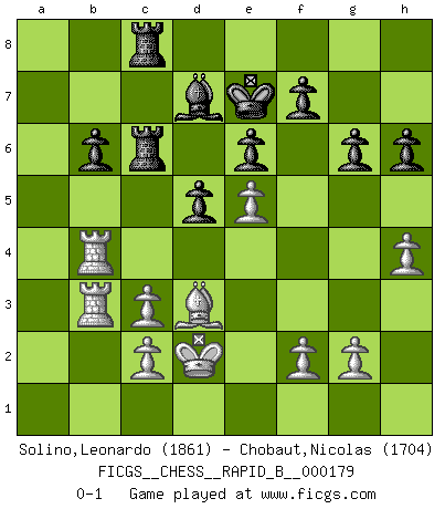 Last move : 0-1 2011 June 19 7:57:42 [Event "FICGS__CHESS__RAPID_B__000179"] [Site "FICGS"] [Date "2011.03.13"] [Round "1"] [White "Solino,Leonardo"] [Black "Chobaut,Nicolas"] [Result "0-1"] [WhiteElo "1861"] [BlackElo "1704"] 1.e4 e6 2.d4 d5 3.Nc3 Nf6 4.Bg5 Bb4 5.e5 h6 6.Bd2 Bxc3 7.bxc3 Ne4 8.Qg4 g6 9.Bd3 Nxd2 10.Kxd2 c5 11.h4 Qa5 12.Nf3 Nc6 13.Qf4 Bd7 14.Rhb1 cxd4 15.Nxd4 Nxd4 16.Qxd4 b6 17.Qb4 Qxb4 18.Rxb4 Ke7 19.a4 Rab8 20.Rab1 Rhc8 21.a5 Rc6 22.R1b3 Rbc8 23.axb6 axb6 0-1 This chess game has been lost on time (started : 2011.03.13 18:35:3) French : MacCutcheon, Lasker variation Player Black won this chess game. Follow this game move after move (download)Chess is life. (Bobby Fischer) Glücklicherweise sind Großmeister Ruben Fines reine Schachbücher weniger phallozentrisch [als seine Schachpsychologie] und deswegen auch weniger lächerlich. (Nigel Short) Yo nunca en mi vida he jugado la Defensa Francesa, que viene siendo la más aburrida de todas las Aperturas. (Wilhelm Steinitz) Shah mat. Le roi est mort. Cri de fierté d'un joueur venant de terrasser son adversaire, courtoisement, sans effusion de sang. Train yourself to let go of everything you fear to lose. (Master Yoda in Star Wars ep.3)