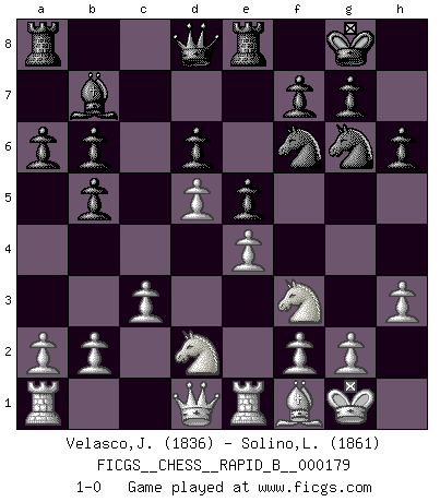 Last move : 1-0 2011 April 30 4:54:0 [Event "FICGS__CHESS__RAPID_B__000179"] [Site "FICGS"] [Date "2011.03.13"] [Round "1"] [White "Velasco,Jose Maria"] [Black "Solino,Leonardo"] [Result "1-0"] [WhiteElo "1836"] [BlackElo "1861"] 1.e4 e5 2.Nf3 Nc6 3.Bb5 a6 4.Ba4 Nf6 5.O-O Bc5 6.c3 b5 7.Bc2 d6 8.d4 Bb6 9.h3 O-O 10.Be3 Bb7 11.Nbd2 Re8 12.Re1 h6 13.d5 Ne7 14.Bxb6 cxb6 15.Bd3 Ng6 16.Bf1 1-0 This chess game has been lost on time (started : 2011.03.13 18:35:3) Ruy Lopez : Moeller defense Kingside Castling by player White (move 5) Kingside Castling by player Black (move 9) Player White won this chess game. Follow this game move after move (download)A strong memory, concentration, imagination, and a strong will is required to become a great Chess player. (Bobby Fischer) Bis zum Jahr 1971 verlief in meiner Schachkariere alles glatt. Dieses dramatische Match [Fischer-Taimanov 6:0] machte mein Leben zur Hölle. (Mark Taimanov) Bobby Fischer es el jugador de Ajedrez mas grande que jamás haya existido. (Ken Smith) La conception d'un plan est le processus par lequel un joueur exploite les avantages de sa position tout en s'efforçant d'en réduire au minimum les inconvénients. Afin de garantir le succès, un plan doit toujours se fonder sur un diagnostic objectif des particularités d'une position. La conception d'un plan est d'autant plus difficile que la position est équilibrée, et grandement facilitée lorsqu'il n'existe qu'un seul plan susceptible de répondre aux exigences de la position. (Harry Golombek) There are 10 types of people in this world: those who understand binary and those who don't. (Anonymous)