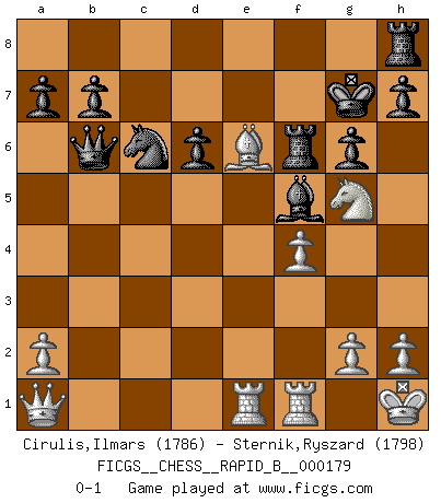 Last move : 0-1 2011 May 26 0:43:11 [Event "FICGS__CHESS__RAPID_B__000179"] [Site "FICGS"] [Date "2011.03.13"] [Round "1"] [White "Cirulis,Ilmars"] [Black "Sternik,Ryszard"] [Result "0-1"] [WhiteElo "1786"] [BlackElo "1798"] 1.e4 e5 2.Nf3 Nc6 3.Bc4 Bc5 4.b4 Bxb4 5.c3 Ba5 6.d4 exd4 7.O-O dxc3 8.Qb3 Qf6 9.Bg5 Qg6 10.Nxc3 Nf6 11.e5 Ng4 12.Nd5 d6 13.Bd3 Qe6 14.Bd2 O-O 15.Ng5 Qd7 16.Bxa5 Nxa5 17.Qc2 g6 18.Nxc7 Rb8 19.e6 fxe6 20.Ncxe6 Rf6 21.Be2 Ne5 22.f4 Nf7 23.Qc3 Nxg5 24.Nxg5 Qd8 25.Bf3 Bf5 26.Bd5+ Kg7 27.Rae1 Rc8 28.Qa1 Nc6 29.Be6 Qb6+ 30.Kh1 Rh8 0-1 Evans gambit : compromised defense Kingside Castling by player White (move 7) Kingside Castling by player Black (move 14) Player Black won this chess game. Follow this game move after move (download)The mistakes are there, waiting to be made. (Savielly Tartakower) Kein Schachspieler kann gut schlafen. (H. G. Wells) Cada Peón es una Reina en potencia. (James Mason) La tactique, c'est ce que vous faites quand il y a quelque chose à faire; la stratégie, c'est ce que vous faites quand il n'y a rien à faire. (Savielli Tartacower) How many people work in NATO Headquarters ? - About half of them. (Dirk Stikker, NATO general secretary)