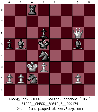 Last move : 0-1 2011 June 1 21:24:10 [Event "FICGS__CHESS__RAPID_B__000179"] [Site "FICGS"] [Date "2011.03.13"] [Round "1"] [White "Chang,Henk"] [Black "Solino,Leonardo"] [Result "0-1"] [WhiteElo "1800"] [BlackElo "1861"] 1.e4 e5 2.f4 exf4 3.Nf3 g5 4.h4 g4 5.Ne5 Nf6 6.Nxg4 Nxe4 7.d3 Ng3 8.Bxf4 Nxh1 9.Qe2+ Qe7 10.Nf6+ Kd8 11.Bxc7+ Kxc7 12.Nd5+ Kd8 13.Nxe7 Bxe7 14.Qg4 d6 15.Qg7 Bxh4+ 16.Kd2 Re8 17.Na3 Ng3 18.Qxh7 Bg5+ 19.Kc3 Be6 20.Qg7 Bh4 21.Qh6 Nf5 22.Qh5 Nd7 23.Be2 Nf6 24.Qf3 Bg5 25.Qxb7 Nd5+ 26.Kb3 Nd4+ 27.Kc4 Nf4 28.Kb4 a5+ 29.Ka4 Bd7+ 30.Nb5 Bxb5+ 31.Ka3 Nxc2+ 32.Kb3 Nxa1+ 33.Ka3 Nc2+ 34.Kb3 Nd4+ 35.Ka3 Nfxe2 36.Qxa8+ Kc7 37.Qa7+ Kc6 38.Qxf7 Rc8 39.Qg6 Nc2+ 40.Kb3 Ned4+ 41.Kc3 Kd5 0-1 KGA : Kieseritsky, Berlin defense Player Black won this chess game. Follow this game move after move (download)If Chess is a science, it's a most inexact one. If Chess is an art, it is too exacting to be seen as one. If Chess is a sport, it's too esoteric. If Chess is a game, it's too demanding to be just a game. If Chess is a mistress, she's a demanding one. If Chess is a passion, it's a rewarding one. If Chess is life, it's a sad one. (Unknown) Später, ... hatte ich zunehmend Erfolg in entscheidenden Partien. Vielleicht weil ich eine einfache Wahrheit erkannte: nicht nur ich hatte Angst, auch mein Gegner. (Mikhail Nekhemyevich Tal) a manera como él juega al Ajedrez, demuestra la completa naturaleza de un hombre. (Stanley Ellin) Il n'y a pas de prix trop élevé au scalp de l'ennemi. (Koblentz) I find your interest interesting. (Gregory House, House M.D.)