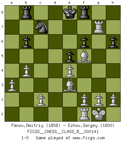 Last move : 1-0 2011 June 22 11:22:14 [Event "FICGS__CHESS__CLASS_B__000141"] [Site "FICGS"] [Date "2011.03.13"] [Round "1"] [White "Panov,Dmitriy"] [Black "Ezhov,Sergey"] [Result "1-0"] [WhiteElo "1858"] [BlackElo "1800"] 1.e4 d6 2.d4 Nf6 3.Nc3 g6 4.Nf3 Bg7 5.Be2 O-O 6.O-O e6 7.Bg5 e5 8.dxe5 dxe5 9.Qxd8 Rxd8 10.Nd5 Nbd7 11.Rad1 Rf8 12.Nxc7 Rb8 13.Be3 Ne8 14.Nd5 Kh8 15.Bxa7 Ra8 16.Be3 f6 17.a3 b6 18.Bb5 Rb8 19.b4 Bb7 20.Bxd7 Bxd5 21.Rxd5 Nc7 22.Rd6 h6 23.Nh4 Kh7 24.Nxg6 Kxg6 25.Bf5+ Kf7 26.Rd7+ Ke8 27.Rxg7 1-0 Pirc : Classical system, 5.Be2 Kingside Castling by player Black (move 5) Kingside Castling by player White (move 6) Player White won this chess game. Follow this game move after move (download)It is the aim of the modern school, not to treat every position according to one general law, but according to the principle inherent in the position. (Richard Reti) Lisa Lane, amerikanische Schachmeisterin, hatte Fischer einmal als stärksten lebenden Spieler bezeichnet. Antwort: Das ist richtig, aber Lisa Lane ist eigentlich nicht in der Lage, das zu beurteilen. (Robert James Fischer) Ciertamente, de todas la drogas del mundo, el Ajedrez debe ser el mas placentero permamentemente. (Assiac) Il (Jacob Murray) ne joue pas pour le bon coup, mais pour le meilleur. (Eloi Relange) What doesn't kill us makes us stronger. (Friedrich Nietzsche)