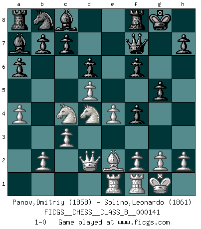 Last move : 1-0 2011 June 28 20:3:58 [Event "FICGS__CHESS__CLASS_B__000141"] [Site "FICGS"] [Date "2011.03.13"] [Round "1"] [White "Panov,Dmitriy"] [Black "Solino,Leonardo"] [Result "1-0"] [WhiteElo "1858"] [BlackElo "1861"] 1.e4 e5 2.Nf3 Nc6 3.Bc4 Bc5 4.c3 Qe7 5.O-O Nf6 6.d4 Bb6 7.a4 a6 8.d5 Nb8 9.Nbd2 d6 10.Qc2 O-O 11.Be2 Nh5 12.Nc4 Ba7 13.Bg5 f6 14.Be3 Nf4 15.Bxf4 exf4 16.Nd4 Qf7 17.Qd2 g5 18.Rae1 1-0 This chess game has been lost on time (started : 2011.03.13 22:21:15) Giuoco Piano : close variation Kingside Castling by player White (move 5) Kingside Castling by player Black (move 10) Player White won this chess game. Follow this game move after move (download)If you aren't afraid of Spassky, then I have removed the element of money. (Jim Slater) Wenn Du einsam bist, wenn Du Dich in der Welt wie ein Fremder fühlst, spiele Schach. Das wird Deinen Geist erheben und Dein Ratgeber im Kampf sein. (Aristoteles) ¿Porque tengo que perder ante este idiota?. (Aron Nimzovich) La vérité est comme le meilleur coup aux échecs : elle existe, mais il faut la chercher. (Arturo Perez-Reverte) All men can see these tactics whereby I conquer, but what none can see is the strategy out of which victory is evolved. (Sun Tzu)