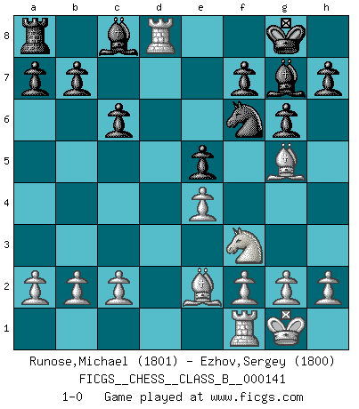 Last move : 1-0 2011 May 18 19:10:37 [Event "FICGS__CHESS__CLASS_B__000141"] [Site "FICGS"] [Date "2011.03.13"] [Round "1"] [White "Runose,Michael"] [Black "Ezhov,Sergey"] [Result "1-0"] [WhiteElo "1801"] [BlackElo "1800"] 1.e4 d6 2.d4 Nf6 3.Nc3 g6 4.Nf3 Bg7 5.Be2 O-O 6.O-O e6 7.Bg5 Re8 8.Qd2 e5 9.dxe5 dxe5 10.Qxd8 Rxd8 11.Nd5 Nbd7 12.Rad1 c6 13.Nxf6+ Nxf6 14.Rxd8+ 1-0 Pirc : Classical system, 5.Be2 Kingside Castling by player Black (move 5) Kingside Castling by player White (move 6) Player White won this chess game. Follow this game move after move (download)My opponents make good moves too. Sometimes I don't take these things into consideration. (Bobby Fischer) Ich las kürzlich ein Buch von Nietzsche. Er sagte Religion verdumme nur die Menschen. Ich stimme zu. (Robert James Fischer) Algunos sacrificios son sólidos, los demás son míos. (Mikhail Tal) J'apprécie les joueurs d'est-indienne, c'est grâce à eux que je nourris ma famille depuis tant d'années. (Petrosian) No enterprise is more likely to succeed than one concealed from the enemy until it is ripe for execution. (Niccolo Machiavelli)