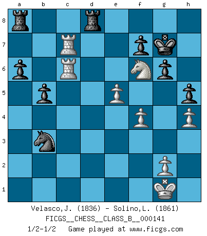Last move : 1/2-1/2 2011 June 9 19:8:9 [Event "FICGS__CHESS__CLASS_B__000141"] [Site "FICGS"] [Date "2011.03.13"] [Round "1"] [White "Velasco,Jose Maria"] [Black "Solino,Leonardo"] [Result "1/2-1/2"] [WhiteElo "1836"] [BlackElo "1861"] 1.e4 e5 2.Nf3 Nc6 3.Bb5 a6 4.Ba4 Nf6 5.O-O Nxe4 6.d4 b5 7.Bb3 d5 8.dxe5 Be6 9.Nbd2 Nc5 10.c3 d4 11.Bxe6 Nxe6 12.cxd4 Ncxd4 13.a4 Bc5 14.Ne4 Bb6 15.Nfg5 Qd7 16.Be3 Nxg5 17.Nxg5 O-O 18.a5 Ba7 19.Qb1 g6 20.Ne4 Qf5 21.Nf6+ Kg7 22.Qxf5 Nxf5 23.Bxa7 Rxa7 24.Rad1 c5 25.Rd5 Nd4 26.Rxc5 Rd8 27.h4 Nb3 28.Rc3 Nxa5 29.f4 Nc4 30.b3 Nd2 31.Rfc1 h5 32.Rc8 Ra8 33.R8c7 Nxb3 34.R1c6 1/2-1/2 Ruy Lopez : Open, 7.Bb3 Kingside Castling by player White (move 5) Kingside Castling by player Black (move 17) This chess game ended in a draw. Follow this game move after move (download)Mistrust is the most necessary characteristic of the Chess player. (Siegbert Tarrasch) Über die Verhaftung Bobby Fischers: Warum es die Bush-Administration für nötig befindet einen 61 Jahre alten Mann zu hetzten, der für niemanden ausser sich selbste eine Gefahr darstellt ist ein Rätsel. (Nigel Short) No hay precio que no valga la pena por la cabellera del Rey enemigo. (Koblentz) Les pièces de l'échiquier étaient impitoyables. Elles le retenaient, elles l'absorbaient. Il y avait de l'horreur en cela, mais aussi une harmonie unique. Car, qu'y a-t-il dans le monde, à part les échecs ? (V. Nabokov) I can't decide which is riskier; taking crazy risks, or taking advice on crazy risks from a crazy risk taker. (Gregory House in House M.D.)