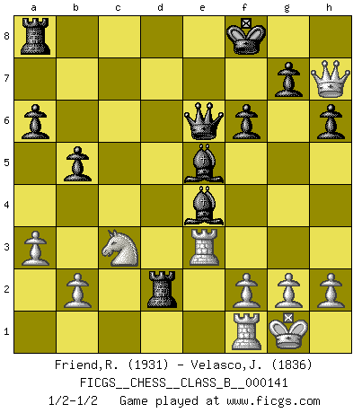 Last move : 1/2-1/2 2011 April 5 16:17:24 [Event "FICGS__CHESS__CLASS_B__000141"] [Site "FICGS"] [Date "2011.03.13"] [Round "1"] [White "Friend,Reuben"] [Black "Velasco,Jose Maria"] [Result "1/2-1/2"] [WhiteElo "1931"] [BlackElo "1836"] 1.Nf3 Nf6 2.c4 c5 3.Nc3 Nc6 4.e3 e6 5.d4 d5 6.a3 cxd4 7.exd4 Be7 8.Bd3 dxc4 9.Bxc4 O-O 10.O-O a6 11.Bg5 h6 12.Bh4 b5 13.Bb3 Bb7 14.Bc2 Qb6 15.Qd3 Rfd8 16.Bxf6 Bxf6 17.Qh7+ Kf8 18.d5 Ne5 19.Nxe5 Bxe5 20.dxe6 Qxe6 21.Rae1 f6 22.Re3 Rd2 23.Be4 Bxe4 1/2-1/2 Reti Opening Kingside Castling by player Black (move 9) Kingside Castling by player White (move 10) This chess game ended in a draw. Follow this game move after move (download)Many have become Chess Masters, no one has become the Master of Chess. (Siegbert Tarrasch) Wer mein Gambit spielt, muß bereit sein, alle Brücken hinter sich abzubrechen. Es verändert den ganzen Menschen. Es wirkt wie ein Zauberstab und fördert verkümmerte, gute Charakter- eigenschaften wieder zu Tage. (Emil Joseph Diemer) Aquel que toma al Peón de Caballo de la Reina, se pasará la noche a dormir en la calle. (Anónimo) D'abord les bases : Jouez et étudiez, puis étudiez et jouez, ensuite jouez et étudiez, puis étudiez et jouez. Deuxièmement : Donnez toujours le meilleur de vous-même ! (Ken Smith) Optimism is a variety of information deficit. Sometimes especially true for correspondence chess games. (Michael Aigner)