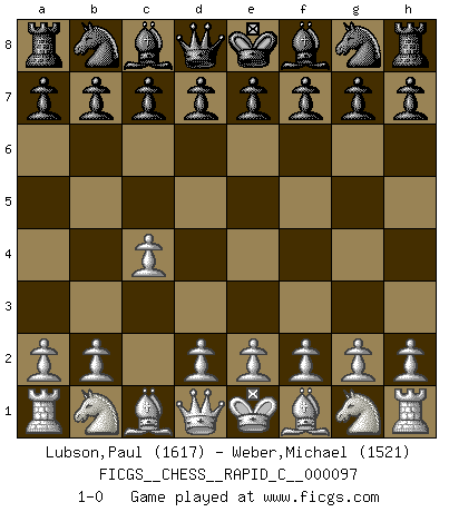 Last move : 1-0 2011 April 16 3:55:44 [Event "FICGS__CHESS__RAPID_C__000097"] [Site "FICGS"] [Date "2011.03.14"] [Round "1"] [White "Lubson,Paul"] [Black "Weber,Michael"] [Result "1-0"] [WhiteElo "1617"] [BlackElo "1521"] 1.c4 1-0 This chess game has been lost on time (started : 2011.03.14 1:57:22) English Opening Player White won this chess game. Follow this game move after move (download)No Chess Grandmaster is normal; they only differ in the extent of their madness. (Viktor Korchnoi) Mein erstes Ziel war nicht, die Partie zu gewinnen, sondern eine Figur zu opfern. -- der junge (Wilhelm Steinitz) El juego del Ajedrez no es solamente una diversión quieta; algunas cualidades muy valuables de la mente se pueden adquirir y cultivar con el, como convertirlos en habitos disponibles para toda ocasión; ya que la vida es algo así como el Ajedrez. (Benjamin Franklin) Je menace de comprendre la position. (Anonyme) Opportunities multiply as they are seized. (Sun Tzu)