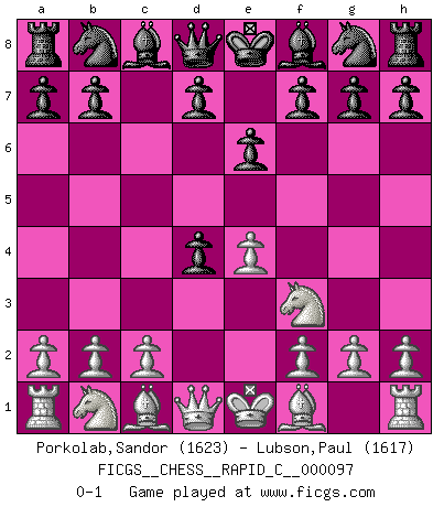 Last move : 0-1 2011 April 18 3:59:43 [Event "FICGS__CHESS__RAPID_C__000097"] [Site "FICGS"] [Date "2011.03.14"] [Round "1"] [White "Porkolab,Sandor"] [Black "Lubson,Paul"] [Result "0-1"] [WhiteElo "1623"] [BlackElo "1617"] 1.e4 c5 2.Nf3 e6 3.d4 cxd4 0-1 This chess game has been lost on time (started : 2011.03.14 1:57:22) Sicilian defense Player Black won this chess game. Follow this game move after move (download)Help your pieces so they can help you. (Paul Morphy) Auf Remis zu spielen ist gewissermaßen ein Verbrechen gegen das Schachspiel. (Mikhail Nekhemyevich Tal) Aquel que ve no otra dirección en el juego que la de dar Jaque Mate a su oponente, nunca será un buen jugador de Ajedrez. (Euwe) Il n'y a pas eu de défaite parce que je ne crois pas que cet ordinateur ait jamais existé. IBM a triché en refusant d'imprimer les modes de recherche de la machine. C'est évident, pendant le match, des coups décisifs ont été joués par des êtres humains. Aujourd'hui, les meilleurs spécialistes en informatique ne peuvent toujours pas expliquer comment Deep-Blue a pu jouer contre la logique des ordinateurs. IBM a gagné une guerre de communication, mais ils sont incapables de prouver que l'ordinateur a gagné tout seul. (Garry Kasparov) Fame, I have already. Now I need the money. (an elderly Steinitz)