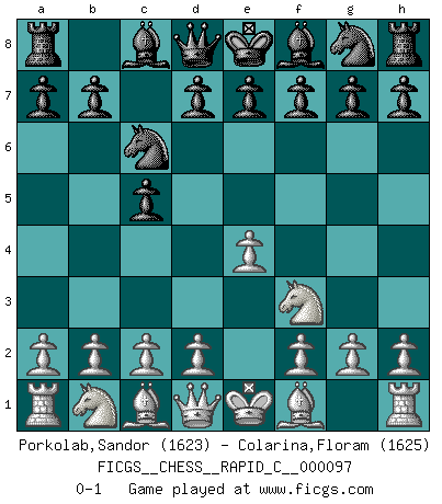 Last move : 0-1 2011 April 18 16:2:31 [Event "FICGS__CHESS__RAPID_C__000097"] [Site "FICGS"] [Date "2011.03.14"] [Round "1"] [White "Porkolab,Sandor"] [Black "Colarina,Floram"] [Result "0-1"] [WhiteElo "1623"] [BlackElo "1625"] 1.e4 c5 2.Nf3 Nc6 0-1 This chess game has been lost on time (started : 2011.03.14 1:57:22) Sicilian defense Player Black won this chess game. Follow this game move after move (download)The beauty of a move lies not in its' appearance but in the thought behind it. (Siegbert Tarrasch) Um dein Spiel zu verbessern musst du zuallererst das Endspiel studieren, denn diese kann unabhängig studiert werden. Die Eröffnung und das Mittelspiel müssen immer in Bezug gesetzt werden zum Endspiel. (José Raúl Capablanca) El Ajedrez, como la música, como el amor, tiene el poder de hacer feliz a la gente. (Siegbert Tarrasch) Les pièces de l'échiquier étaient impitoyables. Elles le retenaient, elles l'absorbaient. Il y avait de l'horreur en cela, mais aussi une harmonie unique. Car, qu'y a-t-il dans le monde, à part les échecs ? (V. Nabokov) Excelling at chess has long been considered a symbol of more general intelligence. That is an incorrect assumption in my view, as pleasant as it might be. But for the purposes of argument and investigation, chess is, in Russkin-Gutman's words, 'an unparalleled laboratory, since both the learning process and the degree of ability obtained can be objectified and quantified, providing an excellent comparative framework on which to use rigorous analytical techniques.' (The Chess Master and the Computer, by Garry Kasparov - 2010)