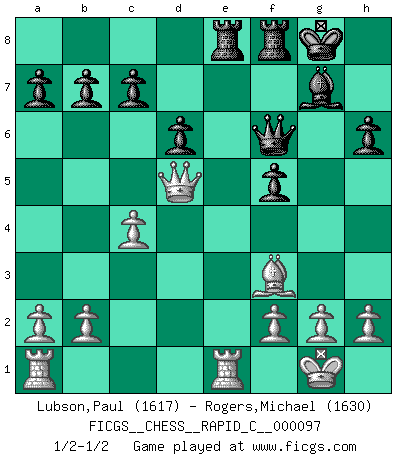 Last move : 1/2-1/2 2011 April 27 0:14:48 [Event "FICGS__CHESS__RAPID_C__000097"] [Site "FICGS"] [Date "2011.03.14"] [Round "1"] [White "Lubson,Paul"] [Black "Rogers,Michael"] [Result "1/2-1/2"] [WhiteElo "1617"] [BlackElo "1630"] 1.c4 f5 2.d4 d6 3.Nc3 Nf6 4.Bg5 e6 5.Nf3 g6 6.e4 h6 7.Bxf6 Qxf6 8.Bd3 Bg7 9.exf5 gxf5 10.O-O O-O 11.Re1 Nc6 12.d5 Ne5 13.dxe6 Bxe6 14.Be2 Rae8 15.Nd5 Nxf3+ 16.Bxf3 Bxd5 17.Qxd5+ 1/2-1/2 English : Anglo-Dutch defense Kingside Castling by player White (move 10) Kingside Castling by player Black (move 10) This chess game ended in a draw. Follow this game move after move (download)All Chess players should have a hobby. (Savielly Tartakower) Wenn Du einsam bist, wenn Du Dich in der Welt wie ein Fremder fühlst, spiele Schach. Das wird Deinen Geist erheben und Dein Ratgeber im Kampf sein. (Aristoteles) Todo lo que importa ante el tablero de Ajedrez son buenas jugadas. (Bobby Fischer) Votre seul travail dans les ouvertures est d'obtenir un milieu de partie jouable. (Lajos Portish) A cynic is a man who knows the price of everything but the value of nothing. (Oscar Wilde)