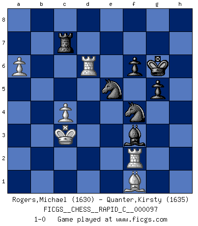 Last move : 1-0 2011 May 27 18:47:16 [Event "FICGS__CHESS__RAPID_C__000097"] [Site "FICGS"] [Date "2011.03.14"] [Round "1"] [White "Rogers,Michael"] [Black "Quanter,Kirsty"] [Result "1-0"] [WhiteElo "1630"] [BlackElo "1635"] 1.e4 c5 2.Nf3 Nc6 3.d4 cxd4 4.Nxd4 e6 5.Nc3 Qc7 6.Ndb5 Qb8 7.Be3 a6 8.Bb6 axb5 9.Nxb5 Bb4+ 10.c3 Ba5 11.Nc7+ Qxc7 12.Bxc7 Bxc7 13.Qg4 g6 14.Bc4 Kf8 15.Qh4 Kg7 16.O-O-O Nf6 17.f3 d6 18.Rhe1 Ra5 19.Kb1 Rh5 20.Qf4 Bb8 21.g4 d5 22.Qe3 Rh3 23.Bf1 Rxh2 24.g5 Nh5 25.Qg1 h6 26.exd5 exd5 27.gxh6+ Rxh6 28.Rxd5 Nf6 29.Rb5 Ba7 30.Qg5 R6h5 31.Qc1 Nd5 32.Bd3 Bf2 33.Re2 Rh1 34.Rxf2 Rxc1+ 35.Kxc1 Nf4 36.Bf1 g5 37.Kc2 f6 38.b3 Kg6 39.Rb6 Ne5 40.c4 Rh7 41.Kc3 Rc7 42.Rd6 b5 43.a4 bxa4 44.bxa4 Bb7 45.a5 Bxf3 46.a6 1-0 Sicilian defense Queenside Castling by player White (move 16) Player White won this chess game. Follow this game move after move (download)Examine moves that smite! A good eye for smites is far more important than a knowledge of strategical principles. (Purdy) Aljechin war kein Nazi. Er war ein Opportunist. Ein schrecklicher Mann. Er liebte Geld über alles und würde für Geld ein Jude, ein Katolik oder ein Protestant werden. (Miguel Najdorf) El tablero es el mundo, las piezas es el fenomeno del universo, las reglas del juego son lo que llamamos leyes de la naturaleza y el jugador del lado opuesto, se encuentra oculto a nuestra vista. (Thomas Huxley) Les échecs, c'est la lutte contre l'erreur. (Johannes Zukertort) I believe in luck. How else can you explain the success of those you dislike ? (Jean Cocteau)