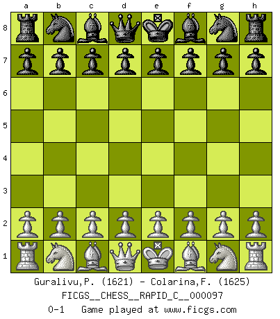 Last move : 0-1 2011 March 14 22:49:17 [Event "FICGS__CHESS__RAPID_C__000097"] [Site "FICGS"] [Date "2011.03.14"] [Round "1"] [White "Guralivu,Paul-Iosif"] [Black "Colarina,Floram"] [Result "0-1"] [WhiteElo "1621"] [BlackElo "1625"] 0-1 Player Black won this chess game. Follow this game move after move (download)In Fischer's hands, a slight theoretical advantage is as good a being a Queen ahead. (Isaac Kashdan) Über die Verhaftung Bobby Fischers: Warum es die Bush-Administration für nötig befindet einen 61 Jahre alten Mann zu hetzten, der für niemanden ausser sich selbste eine Gefahr darstellt ist ein Rätsel. (Nigel Short) El Ajedrez es en su esencia, un juego. En su forma, un arte. Y en su ejecución, una ciencia. (Baron Tassilo) Karpov est une pièce de musée. (Garry Kasparov) It's not a bug - it's an undocumented feature. (Anonymous)