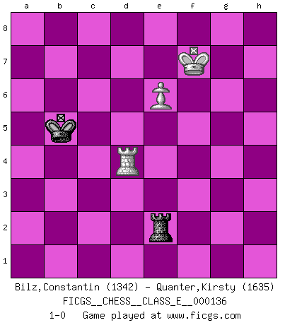 Last move : 1-0 2011 May 27 18:47:16 [Event "FICGS__CHESS__CLASS_E__000136"] [Site "FICGS"] [Date "2011.03.14"] [Round "1"] [White "Bilz,Constantin"] [Black "Quanter,Kirsty"] [Result "1-0"] [WhiteElo "1342"] [BlackElo "1635"] 1.Nf3 c5 2.g3 Nc6 3.Bg2 d5 4.d4 e6 5.O-O cxd4 6.Nxd4 Bc5 7.Nb3 Bb6 8.c4 Nf6 9.cxd5 Nxd5 10.Nc3 Nxc3 11.Qxd8+ Nxd8 12.bxc3 Bd7 13.a4 Bc6 14.a5 Bxg2 15.Kxg2 Bc7 16.a6 e5 17.axb7 Nxb7 18.Ra6 Bb6 19.Ba3 Rc8 20.Rc1 Rc4 21.Nd2 Rc7 22.c4 Nc5 23.Bxc5 Bxc5 24.Nb3 Be7 25.Na5 h5 26.Rc6 Bd8 27.Rb1 h4 28.Rb8 Kd7 29.Rxc7+ Kxc7 30.Rb7+ Kd6 31.Rxa7 Bxa5 32.Ra6+ Bb6 33.Rxb6+ Kc7 34.Ra6 hxg3 35.fxg3 Kb7 36.Ra5 f6 37.h4 Kb6 38.Rb5+ Kc6 39.Rd5 Rg8 40.Kf3 Rh8 41.Ke4 Rh5 42.Rd8 g5 43.Rf8 gxh4 44.Rxf6+ Kc5 45.gxh4 Kxc4 46.Rc6+ Kb5 47.Rc1 Kb6 48.Kd5 Rxh4 49.Kxe5 Rh5+ 50.Kd4 Rh8 51.e4 Rd8+ 52.Ke3 Kb7 53.Kf4 Rf8+ 54.Ke5 Re8+ 55.Kf5 Rf8+ 56.Kg6 Re8 57.Rc4 Kb6 58.Kf7 Kb5 59.Rd4 Rh8 60.e5 Rh7+ 61.Kg6 Rh2 62.e6 Re2 63.Kf7 1-0 Reti Opening Kingside Castling by player White (move 5) 10 pieces endgame at move 43 : White KRPPP , Black KRPPP WHITE : King + 1 Rook 3 Pawns BLACK : King + 1 Rook 3 Pawns 9 pieces endgame at move 44 : White KRPPP , Black KRPP WHITE : King + 1 Rook 3 Pawns BLACK : King + 1 Rook 2 Pawns 8 pieces endgame at move 45 : White KRPPP , Black KRP WHITE : King + 1 Rook 3 Pawns BLACK : King + 1 Rook 1 Pawn 7 pieces endgame at move 45 : White KRPP , Black KRP WHITE : King + 1 Rook 2 Pawns BLACK : King + 1 Rook 1 Pawn 6 pieces endgame at move 48 : White KRP , Black KRP WHITE : King + 1 Rook 1 Pawn BLACK : King + 1 Rook 1 Pawn 5 pieces endgame at move 49 : White KRP , Black KR WHITE : King + 1 Rook 1 Pawn BLACK : King + 1 Rook Player White won this chess game. Follow this game move after move (download)All I want to do, ever, is just play Chess. (Bobby Fischer) Wie, soll nun auch die Opposition abgeschafft werden? Ja, es tut mir leid, Ihnen diesen Schmerz nicht ersparen zu können. (Aaron Nimzowitsch) No hay precio que sea tan grande por la cabellera del Rey enemigo. (Koblentz) J'ai vu le vaincu d'Echecs jouer des années durant dans l'espoir de la fête de la victoire. Car tu es plus riche de ce qu'elle existe si même elle n'est point pour toi. Ainsi de la perle du fond des mers. (Antoine de Saint-Exupéry) Mandala - that's it! 16x16 squares as multiple of the four and the eight because of the Four Noble Truths and the Noble Eightfold Path. (Heinz-Georg Lehnhoff about Big Chess)