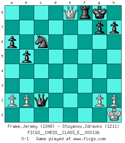 Last move : 0-1 2011 March 18 21:11:30 [Event "FICGS__CHESS__CLASS_E__000136"] [Site "FICGS"] [Date "2011.03.14"] [Round "1"] [White "Frame,Jeremy"] [Black "Stoyanov,Zdravko"] [Result "0-1"] [WhiteElo "1348"] [BlackElo "1211"] 1.e4 c5 2.Nf3 a6 3.d4 cxd4 4.Nxd4 e5 5.Nf5 Qf6 6.Bc4 Bc5 7.O-O d6 8.Nc3 Bxf5 9.exf5 Qxf5 10.Nd5 Qc8 11.Be3 b5 12.Bd3 Bxe3 13.Nxe3 Nf6 14.f3 Qc5 15.Be4 Nxe4 16.fxe4 Qxe3+ 17.Kh1 O-O 18.Qxd6 Qxe4 19.Rae1 Qxc2 20.Rxe5 Nc6 21.Ref5 Rad8 22.Rxf7 Rxf7 23.Qe6 Rdf8 24.Rxf7 Rxf7 25.Qe8+ Rf8 0-1 Sicilian : O'Kelly variation Kingside Castling by player White (move 7) Kingside Castling by player Black (move 17) Player Black won this chess game. Follow this game move after move (download)The Pin is mightier than the sword. (Fred Reinfeld) Wer nie einen Fehler gemacht hat, hat nie etwas Neues ausprobiert. (Albert Einstein) Mi estilo es algo parecido entre un poco de Tal y Petrosian. (Reshevsky) Pour moi, les échecs ne sont pas un jeu mais un art. (Alexandre Alekhine) The problem with manipulation is that people can turn on you. (Horatio Caine, C.S.I. Miami)
