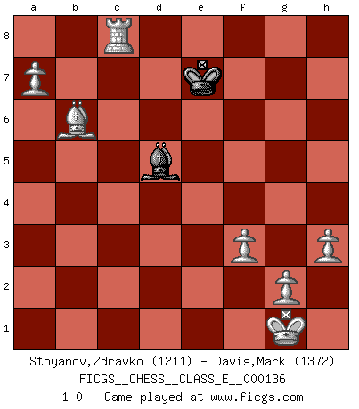 Last move : 1-0 2011 May 29 22:6:15 [Event "FICGS__CHESS__CLASS_E__000136"] [Site "FICGS"] [Date "2011.03.14"] [Round "1"] [White "Stoyanov,Zdravko"] [Black "Davis,Mark"] [Result "1-0"] [WhiteElo "1211"] [BlackElo "1372"] 1.e4 c5 2.Nf3 Nc6 3.Bb5 d6 4.Bxc6+ bxc6 5.h3 Nf6 6.d3 e6 7.O-O Be7 8.Nc3 O-O 9.Re1 Bb7 10.Be3 Re8 11.a3 Rb8 12.e5 Nd7 13.exd6 Bxd6 14.Na4 Ba6 15.c4 Bb7 16.Ng5 h6 17.Nf3 Qa5 18.Nc3 Nf6 19.Qd2 Qc7 20.b3 Bc8 21.Bxh6 Nh5 22.Qg5 g6 23.Ne4 Be7 24.Qe5 Qxe5 25.Nxe5 Bb7 26.a4 Rbc8 27.Re3 f6 28.Nxg6 f5 29.Nxe7+ Rxe7 30.Nd6 R8c7 31.Rae1 Kh7 32.Rxe6 Rxe6 33.Rxe6 Ba6 34.Be3 Ng7 35.Re5 Rd7 36.Nxf5 Nxf5 37.Rxf5 Rxd3 38.Rxc5 Rxb3 39.Rxc6 Bb7 40.Rc7+ Kg6 41.Bxa7 Kf5 42.a5 Ba6 43.Bb6 Rc3 44.c5 Bd3 45.f3 Rc2 46.c6 Bc4 47.Rc8 Be6 48.Rf8+ Ke5 49.c7 Kd6 50.a6 Ke7 51.a7 Bd5 52.c8Q Rxc8 53.Rxc8 1-0 Sicilian : Nimzovich-Rossolimo attack (without ...d6) Kingside Castling by player White (move 7) Kingside Castling by player Black (move 8) Promotion Queen by player White (move 52) 10 pieces endgame at move 52 : White KRBPPPP , Black KRB WHITE : King + 1 Rook 1 Bishop 4 Pawns BLACK : King + 1 Rook 1 Bishop 9 pieces endgame at move 53 : White KRBPPPP , Black KB WHITE : King + 1 Rook 1 Bishop 4 Pawns BLACK : King + 1 Bishop Player White won this chess game. Follow this game move after move (download)The Pawns are the soul of the game. (Francois Andre Danican Philidor) Wenn es im Universum noch irgendwo intelligente Lebewesen gibt, dann kennen sie Go. (Emanuel Lasker) Las leyes del Ajedrez no permiten una libre elección: tienes que mover quieras o no. (Emanuel Lasker) Je ne crois pas en la psychologie, je crois aux bons coups. (Robert Fischer) He who defends everything defends nothing. (Frederick the Great)
