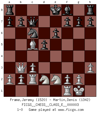 Last move : 1-0 2006 July 7 1:2:35 [Event "FICGS__CHESS__CLASS_E__000003"] [Site "FICGS"] [Date "2006.05.02"] [Round "1"] [White "Frame,Jeremy"] [Black "Martin,Denis"] [Result "1-0"] [WhiteElo "1520"] [BlackElo "1342"] 1.e4 c5 2.c3 d5 3.e5 Nc6 4.d4 Qb6 5.Nf3 Bg4 6.dxc5 Qxc5 7.Be3 Qa5 8.Be2 e6 9.Nbd2 Nge7 10.h3 Bh5 11.Qb3 Qc7 12.O-O Nxe5 13.Nd4 Bxe2 14.Nxe2 N7c6 15.Rac1 Nd3 16.Rc2 Nc5 17.Bxc5 1-0 Sicilian : Alapin's variation (2.c3) Kingside Castling by player White (move 12) Player White won this chess game. Follow this game move after move (download)Chess is life. (Bobby Fischer) Schachspieler können ausgezeichnet Varianten am Schachbrett berechnen, aber nicht im realen Leben. Zu stark ist der Individualismus im Schach ausgeprägt, und für viele ist ein kleiner momentaner persönlicher Vorteil wichtiger als ein weit größerer Vorteil von morgen. (Anatoly Karpov) No es una movida, aún la mejor movida que tu debas buscar, sino un plan comprensible. (Eugene Znosko-Borovsky) Shah mat. Le roi est mort. Cri de fierté d'un joueur venant de terrasser son adversaire, courtoisement, sans effusion de sang. The Internet is the world's largest library. It's just that all the books are on the floor. (John Allen Paulos)
