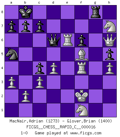 Last move : 1-0 2007 January 13 7:43:48 [Event "FICGS__CHESS__RAPID_C__000016"] [Site "FICGS"] [Date "2006.12.14"] [Round "1"] [White "MacNair,Adrian"] [Black "Glover,Brian"] [Result "1-0"] [WhiteElo "1273"] [BlackElo "1400"] 1.e4 e5 2.Bc4 Nf6 3.Nf3 Nc6 4.d3 Bc5 5.O-O d6 6.Nc3 Bg4 7.h3 Bh5 8.Re1 Qd7 9.Be3 O-O-O 10.Bxc5 dxc5 11.a3 Nd4 12.Nxe5 Qe7 13.Ng4 Bg6 14.f4 h5 15.Nf2 Bh7 16.Qd2 Nd7 17.Ncd1 Nb6 18.Ba2 c4 19.c3 Nc6 20.d4 Qh4 21.f5 Rd6 22.e5 R6d8 23.Bb1 g6 24.Re4 Qe7 25.f6 Qe6 26.Qg5 Rd5 27.Ne3 R5d8 28.Bc2 Na5 29.h4 Nd5 30.Nf1 Qf5 31.Qh6 Qe6 32.Nh3 Nxf6 33.exf6 Qxf6 34.Rf4 Qe7 35.Ng5 f6 36.Nxh7 Rdg8 37.Bxg6 Rg7 38.Bf5+ Kb8 39.Re1 Rxg2+ 40.Kxg2 Rg8+ 41.Kf2 Qd6 42.Re6 1-0 Bishop's Opening : Berlin defense Kingside Castling by player White (move 5) Queenside Castling by player Black (move 9) Player White won this chess game. Follow this game move after move (download)The winner of the game is the player who makes the next-to-last mistake. (Savielly Tartakover) Verschiedene, sehr schätzbare und im Laufe des Lebens nützliche Eigenschaften des Geistes können durch das Schachspiel erworben und gekräftigt werden, so dass sie zu Gewohnheiten werden, die uns nie im Stich lassen. (Benjamin Franklin) Cuando le juegas a Fischer, no es una cuestion de si vas a ganar o perder. Es una cuestion de si vas a sobrevivir. (Boris Spassky) Les Cavaliers se révèlent fort utiles dans les positions fermées. D'habitude, les Fous sont un peu plus forts que les Cavaliers dans les positions ouvertes. Qu'on le veuille ou non, il restera toujours des exceptions ! Luck is what you have left over after you give 100 percent. (Langston Coleman)