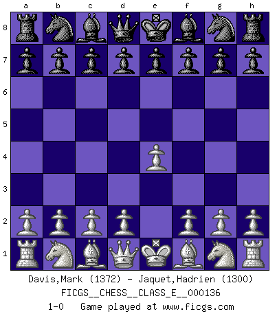 Last move : 1-0 2011 April 28 16:46:3 [Event "FICGS__CHESS__CLASS_E__000136"] [Site "FICGS"] [Date "2011.03.14"] [Round "1"] [White "Davis,Mark"] [Black "Jaquet,Hadrien"] [Result "1-0"] [WhiteElo "1372"] [BlackElo "1300"] 1.e4 1-0 This chess game has been lost on time (started : 2011.03.14 13:38:41) King's pawn Opening Player White won this chess game. Follow this game move after move (download)There are two types of sacrifices: correct ones and mine. (Mikhail Tal) Gewöhnliche Menschen denken nur daran, wie sie ihre Zeit verbringen. Ein intelligenter Mensch versucht, sie auszunutzen. (Arthur Schopenhauer) Siempre es mejor sacrificar los hombres de tu oponente. (Savielly Tartakower) Je menace de comprendre la position. (Anonyme) I can't decide which is riskier; taking crazy risks, or taking advice on crazy risks from a crazy risk taker. (Gregory House in House M.D.)