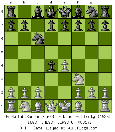 Last move : 0-1 2011 April 26 16:37:27 [Event "FICGS__CHESS__CLASS_C__000172"] [Site "FICGS"] [Date "2011.03.14"] [Round "1"] [White "Porkolab,Sandor"] [Black "Quanter,Kirsty"] [Result "0-1"] [WhiteElo "1623"] [BlackElo "1635"] 1.e4 c5 2.Nf3 Nc6 3.d4 cxd4 0-1 This chess game has been lost on time (started : 2011.03.14 20:9:51) Sicilian defense Player Black won this chess game. Follow this game move after move (download)The chessboard is the world, the pieces are the phenomena of the Universe, the rules of the game are what we call the laws of Nature and the player on the other side is hidden from us. (Thomas Huxley) Es ist schade, dass viele Schachsportler vergessen, wie wichtig Auftreten und angemessene Kleidung sind. (Alexandra Kosteniuk) El Ajedrez es tan inspirador que yo no creo que un buen jugador sea capaz de tener un pensamiento malo durante una partida. (Wilhelm Steinitz) Le joueur d'Echecs qui veut atteindre le top est obligé de développer son propre credo créatif. Alexeï Stepanovicth Souétine. Il est facile d'écrire des livres ! Ce qui est difficile, c'est de jouer ! (Alexeï Stepanovicth Souétine) Just because you do not take an interest in politics doesn't mean politics won't take an interest in you. (Pericles 430 B.C.)