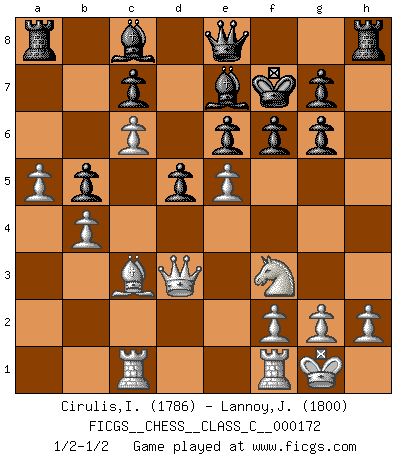 Last move : 1/2-1/2 2011 June 8 20:25:0 [Event "FICGS__CHESS__CLASS_C__000172"] [Site "FICGS"] [Date "2011.03.14"] [Round "1"] [White "Cirulis,Ilmars"] [Black "Lannoy,Jean-Claude"] [Result "1/2-1/2"] [WhiteElo "1786"] [BlackElo "1800"] 1.e4 Nf6 2.e5 Nd5 3.c4 Nb6 4.c5 Nd5 5.Nc3 Nxc3 6.dxc3 d6 7.Nf3 d5 8.Be3 e6 9.Bd3 Be7 10.O-O Nd7 11.b4 a5 12.Bd4 axb4 13.cxb4 b6 14.c6 Nf8 15.Qb3 Ng6 16.a4 f6 17.Bxg6+ hxg6 18.a5 b5 19.Qd3 Kf7 20.Bc3 Qe8 21.Rac1 1/2-1/2 Alekhine's defense : Two pawns' (Lasker's) attack Kingside Castling by player White (move 10) This chess game ended in a draw. Follow this game move after move (download)I am the best player in the world and I am here to prove it. (Bobby Fischer) Die Neutralität betrachte ich als eine schwere Krankheit. (Viktor Kortschnoi) La única cosa que los jugadores de Ajedrez tienen en común, es el Ajedrez. (Lodewijk Prins) Avant la finale, les dieux ont créé le milieu de partie. (Tarrasch) Crush them ! Make them suffer ! (General Grievous in Star Wars ep.3)