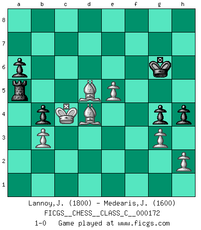 Last move : 1-0 2011 April 26 7:35:29 [Event "FICGS__CHESS__CLASS_C__000172"] [Site "FICGS"] [Date "2011.03.14"] [Round "1"] [White "Lannoy,Jean-Claude"] [Black "Medearis,John"] [Result "1-0"] [WhiteElo "1800"] [BlackElo "1600"] 1.c4 e5 2.Nc3 Nf6 3.g3 d5 4.cxd5 Nxd5 5.Nf3 f6 6.Bg2 Nb6 7.d4 exd4 8.Nxd4 c5 9.Ndb5 a6 10.Qxd8+ Kxd8 11.Na3 Nc6 12.Nc2 Ke8 13.Be3 Be6 14.O-O Rc8 15.b3 Be7 16.Rfd1 Nd7 17.f4 Kf7 18.Bf2 g5 19.Nd5 Rhe8 20.Nce3 Kg7 21.Nxe7 Rxe7 22.f5 Bf7 23.Rac1 b6 24.Rd6 Nde5 25.Rcd1 g4 26.Kf1 h5 27.Be1 b5 28.Rxf6 Kxf6 29.Rd6+ Kg7 30.f6+ Kf8 31.fxe7+ Kxe7 32.Nf5+ Ke8 33.Bc3 c4 34.Rxc6 Rxc6 35.Bxe5 Rc5 36.Nd6+ Ke7 37.Nxf7 Kxf7 38.Bd4 Rf5 39.Ke1 cxb3 40.Be4 Rg5 41.axb3 b4 42.Kd2 Ra5 43.Kd3 Ra2 44.Bd5+ Kg6 45.e4 Ra5 46.Kc4 h4 47.e5 1-0 English : Bremen, reverse Dragon Kingside Castling by player White (move 14) Player White won this chess game. Follow this game move after move (download)Strategy requires thought, tactics require observation. (Max Euwe) Es liegt in der Natur, vernüftig zu denken und unlogisch zu handeln. (Anatole France) El Ajedrez es parte de una cultura y si una cultura esta en decadencia, entonces también el Ajedrez declinará. (Mikhail Botvinnik) La tactique est l'élément le plus important du milieu de jeu. (Siegbert Tarrasch) I don't know, I don't care, and it doesn't make any difference. (Albert Einstein)