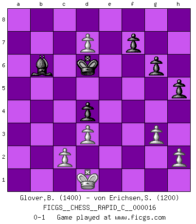 Last move : 0-1 2007 January 24 21:0:17 [Event "FICGS__CHESS__RAPID_C__000016"] [Site "FICGS"] [Date "2006.12.14"] [Round "1"] [White "Glover,Brian"] [Black "von Erichsen,Svante Carl"] [Result "0-1"] [WhiteElo "1400"] [BlackElo "1200"] 1.e4 c5 2.Nf3 Nc6 3.Nc3 d6 4.Bc4 Nf6 5.d3 g6 6.Be3 Bg7 7.O-O O-O 8.Qd2 Bg4 9.Qe2 Bxf3 10.Qxf3 Qb6 11.Bb3 e6 12.a3 Nd4 13.Bxd4 cxd4 14.Ne2 e5 15.Rab1 Rac8 16.Qh3 Rfe8 17.f4 exf4 18.Rxf4 Qc5 19.Rbf1 Qe5 20.R4f2 d5 21.Ng3 b5 22.Re2 Rf8 23.exd5 Qd6 24.Ne4 Nxe4 25.Rxe4 a5 26.Rf2 a4 27.Ba2 b4 28.axb4 Qxb4 29.Qd7 Rcd8 30.Qa7 Qd6 31.Qxa4 Ra8 32.Qb3 Rfb8 33.Qc4 Rb4 34.Qc6 Qxc6 35.dxc6 Rxa2 36.Re8+ Bf8 37.Rc8 Ra1+ 38.Rf1 Rxf1+ 39.Kxf1 Ra4 40.Rb8 Ra7 41.b4 Kg7 42.b5 Rc7 43.Rd8 Bc5 44.Rd7 Rxd7 45.cxd7 Bb6 46.Kf2 Kf6 47.Kf3 Ke5 48.g3 h5 49.Ke2 Ba5 50.Kd1 Kd6 51.b6 Bxb6 0-1 Sicilian defense Kingside Castling by player White (move 7) Kingside Castling by player Black (move 7) Player Black won this chess game. Follow this game move after move (download)I have always a slight feeling of pity for the man who has no knowledge of Chess. (Siegbert Tarrasch) Ich bin stolz ein Bulgare zu sein. (Veselin Topalov) Vive, pierde y aprende al observar a tu oponente como gana. (Amber Steenbock) Un footballeur joue avec ses pieds, parfois avec sa tête. Un joueur d'échecs ne joue qu'avec sa tête. Et quand il ne joue plus, il meurt. (Jacob Murray) In every real man a child is hidden that wants to play. (Friedrich Nietzsche)