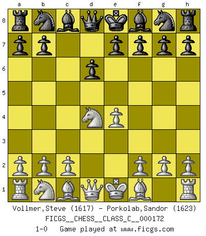 Last move : 1-0 2011 April 26 4:35:22 [Event "FICGS__CHESS__CLASS_C__000172"] [Site "FICGS"] [Date "2011.03.14"] [Round "1"] [White "Vollmer,Steve"] [Black "Porkolab,Sandor"] [Result "1-0"] [WhiteElo "1617"] [BlackElo "1623"] 1.e4 c5 2.Nf3 d6 3.d4 cxd4 4.Nxd4 1-0 This chess game has been lost on time (started : 2011.03.14 20:9:51) Sicilian Player White won this chess game. Follow this game move after move (download)Chess is as much a mystery as women. (Purdy) Ein Schachgenie ist jemand der verdammt gut Schach spielt. (Jonathan Levitt) En un gambito tu regalas un Peón por el bién de tomar un juego perdido. (Samuel Standige Boden) À la honte des hommes, on sait que les lois du jeu sont les seules qui soient partout justes, claires, inviolables et exécutées. Pourquoi l'Indien qui a donné les règles du jeu d'échecs est-il obéi de bon gré dans toute la terre, et que les décrétales des papes, par exemple, sont aujourd'hui un objet d'horreur et de mépris ? C'est que l'inventeur des échecs combina tout avec justesse pour la satisfaction des joueurs, et que les papes, dans leurs décrétales, n'eurent en vue que leur seul avantage. L'Indien voulut exercer également l'esprit des hommes et leur donner du plaisir; les papes ont voulu abrutir l'esprit des hommes. Voltaire (Dictionnaire philosophique / Garnier 1967) Every vice is only an exaggeration of a necessary and virtuous function. (Ralph Waldo Emerson, Journals 1936)